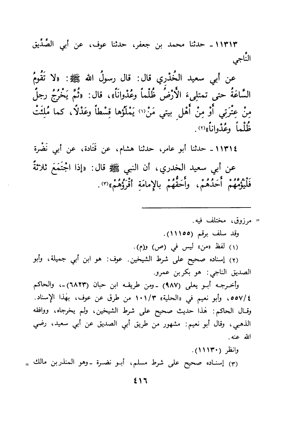 ١١٣١٣ - حَدَّثَنَا مُحَمَّدُ بْنُ جَعْفَرٍ، حَدَّثَنَا عَوْفٌ، عَنْ أَبِي الصِّدِّيقِ النَّاجِيِّ، عَنْ أَبِي سَعِيدٍ الْخُدْرِيِّ، قَالَ: قَالَ رَسُولُ اللهِ صَلَّى اللهُ عَلَيْهِ وَسَلَّمَ: " لَا تَقُومُ السَّاعَةُ حَتَّى تَمْتَلِئَ الْأَرْضُ ظُلْمًا وَعُدْوَانًا " قَالَ: " ثُمَّ يَخْرُجُ رَجُلٌ مِنْ عِتْرَتِي - أَوْ مِنْ أَهْلِ بَيْتِي - مَنْ (١) يَمْلَؤُهَا قِسْطًا وَعَدْلًا، كَمَا مُلِئَتْ ظُلْمًا وَعُدْوَانًا " (٢)