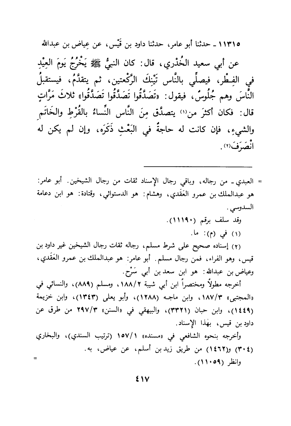 ١١٣١٥ - حَدَّثَنَا أَبُو عَامِرٍ، حَدَّثَنَا دَاوُدُ بْنُ قَيْسٍ، عَنْ عِيَاضِ بْنِ عَبْدِ اللهِ، عَنْ أَبِي سَعِيدٍ الْخُدْرِيِّ، قَالَ: كَانَ النَّبِيُّ صَلَّى اللهُ عَلَيْهِ وَسَلَّمَ يَخْرُجُ يَوْمَ الْعِيدِ فِي الْفِطْرِ، فَيُصَلِّي بِالنَّاسِ تَيْنِكَ الرَّكْعَتَيْنِ، ثُمَّ يَتَقَدَّمُ فَيَسْتَقْبِلُ النَّاسَ وَهُمْ جُلُوسٌ، فَيَقُولُ: " تَصَدَّقُوا، تَصَدَّقُوا، تَصَدَّقُوا " ثَلَاثَ مَرَّاتٍ، قَالَ: فَكَانَ أَكْثَرَ مَنْ (١) يَتَصَدَّقُ مِنَ النَّاسِ النِّسَاءُ بِالْقُرْطِ، وَالْخَاتَمِ، وَالشَّيْءِ، فَإِنْ كَانَتْ لَهُ حَاجَةٌ فِي الْبَعْثِ ذَكَرَهُ، وَإِنْ لَمْ يَكُنْ لَهُ انْصَرَفَ (٢)