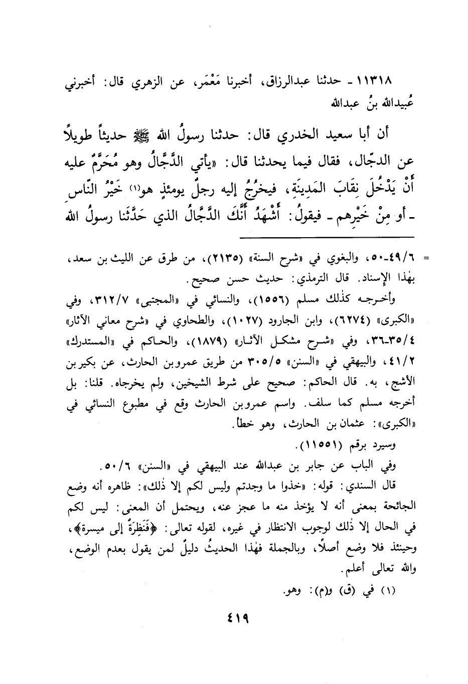 ١١٣١٨ - حَدَّثَنَا عَبْدُ الرَّزَّاقِ، أَخْبَرَنَا مَعْمَرٌ، عَنِ الزُّهْرِيِّ، قَالَ: أَخْبَرَنِي عُبَيْدُ اللهِ بْنُ عَبْدِ اللهِ، أَنَّ أَبَا سَعِيدٍ الْخُدْرِىَّ، قَالَ: حَدَّثَنَا رَسُولُ اللهِ صَلَّى اللهُ عَلَيْهِ وَسَلَّمَ حَدِيثًا طَوِيلًا عَنِ الدَّجَّالِ، فَقَالَ فِيمَا يُحَدِّثُنَا قَالَ: " يَأْتِي الدَّجَّالُ وَهُوَ مُحَرَّمٌ عَلَيْهِ أَنْ يَدْخُلَ نِقَابَ الْمَدِينَةِ، فَيَخْرُجُ إِلَيْهِ رَجُلٌ يَوْمَئِذٍ هُوَ (١) خَيْرُ النَّاسِ - أَوْ مِنْ خَيْرِهِمْ - فَيَقُولُ: أَشْهَدُ أَنَّكَ الدَّجَّالُ الَّذِي حَدَّثَنَا رَسُولُ اللهِ