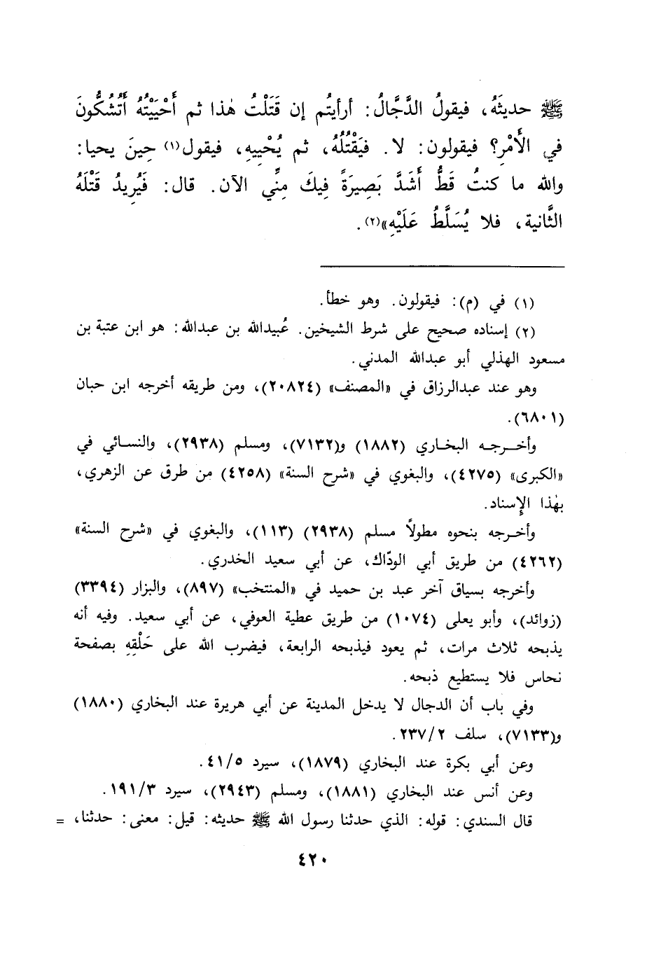 صَلَّى اللهُ عَلَيْهِ وَسَلَّمَ حَدِيثَهُ، فَيَقُولُ الدَّجَّالُ: أَرَأَيْتُمْ إِنْ قَتَلْتُ هَذَا ثُمَّ أَحْيَيْتُهُ أَتَشُكُّونَ فِي الْأَمْرِ، فَيَقُولُونَ: لَا، فَيَقْتُلُهُ ثُمَّ يُحْيِيهِ، (١) فَيَقُولُ حِينَ يَحْيَا: وَاللهِ مَا كُنْتُ قَطُّ أَشَدَّ بَصِيرَةً فِيكَ مِنِّي الْآنَ، قَالَ: فَيُرِيدُ قَتْلَهُ الثَّانِيَةَ فَلَا يُسَلَّطُ عَلَيْهِ " (٢)
