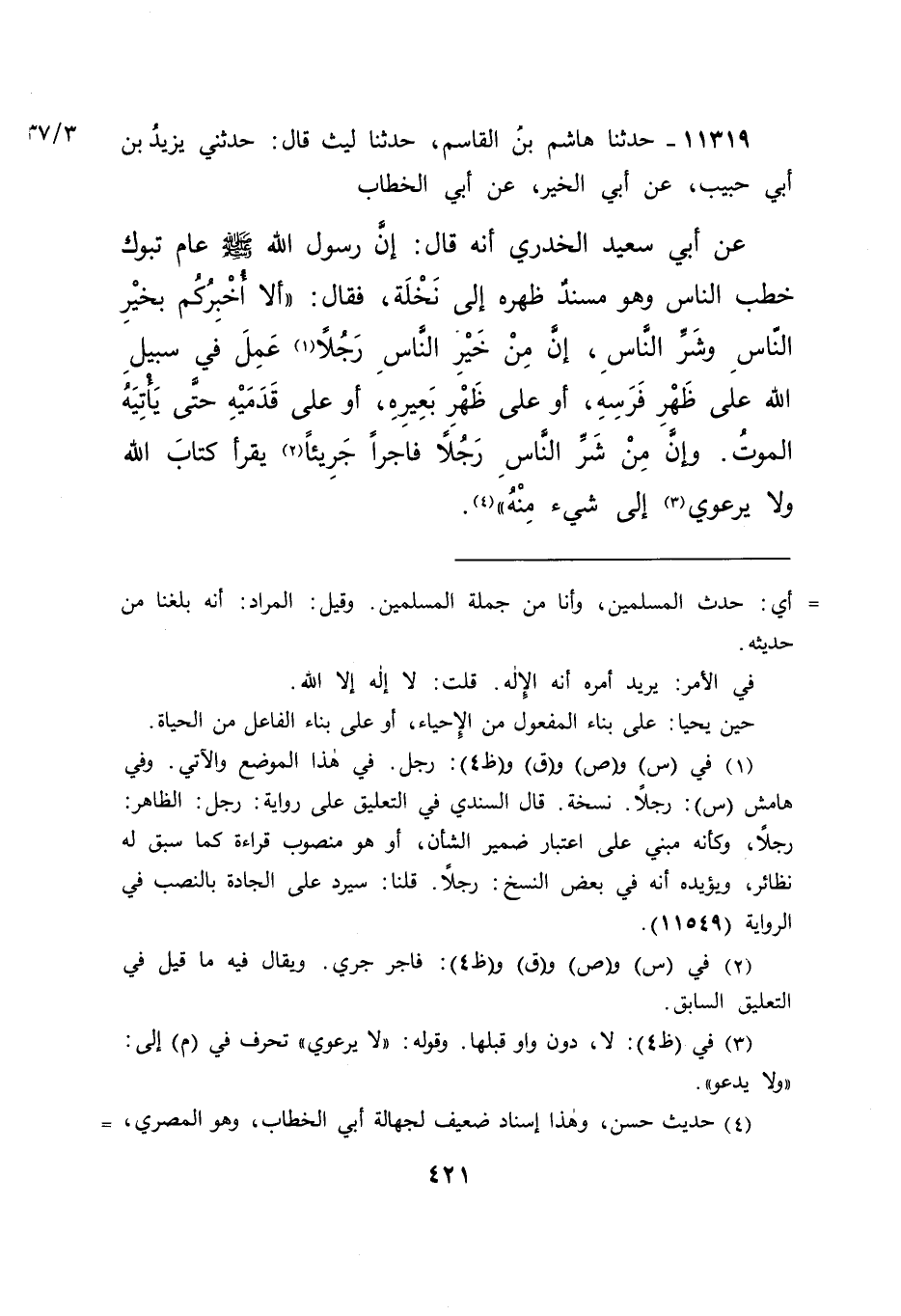 ١١٣١٩ - حَدَّثَنَا هَاشِمُ بْنُ الْقَاسِمِ، حَدَّثَنَا لَيْثٌ، قَالَ: حَدَّثَنِي يَزِيدُ بْنُ أَبِي حَبِيبٍ، عَنْ أَبِي الْخَيْرِ، عَنْ أَبِي الْخَطَّابِ، عَنْ أَبِي سَعِيدٍ الْخُدْرِيِّ، أَنَّهُ قَالَ: إِنَّ رَسُولَ اللهِ صَلَّى اللهُ عَلَيْهِ وَسَلَّمَ عَامَ تَبُوكَ خَطَبَ النَّاسَ وَهُوَ مُسْنِدٌ ظَهْرَهُ إِلَى نَخْلَةٍ، فَقَالَ: " أَلَا أُخْبِرُكُمْ بِخَيْرِ النَّاسِ وَشَرِّ النَّاسِ، إِنَّ مِنْ خَيْرِ النَّاسِ: رَجُلًا (١) عَمِلَ فِي سَبِيلِ اللهِ عَلَى ظَهْرِ فَرَسِهِ - أَوْ عَلَى ظَهْرِ بَعِيرِهِ، أَوْ عَلَى قَدَمَيْهِ - حَتَّى يَأْتِيَهُ الْمَوْتُ، وَإِنَّ مِنْ شَرِّ النَّاسِ: رَجُلًا فَاجِرًا جَرِيئًا، (٢) يَقْرَأُ كِتَابَ اللهِ وَلَا يَرْعَوِي (٣) إِلَى شَيْءٍ مِنْهُ " (٤)