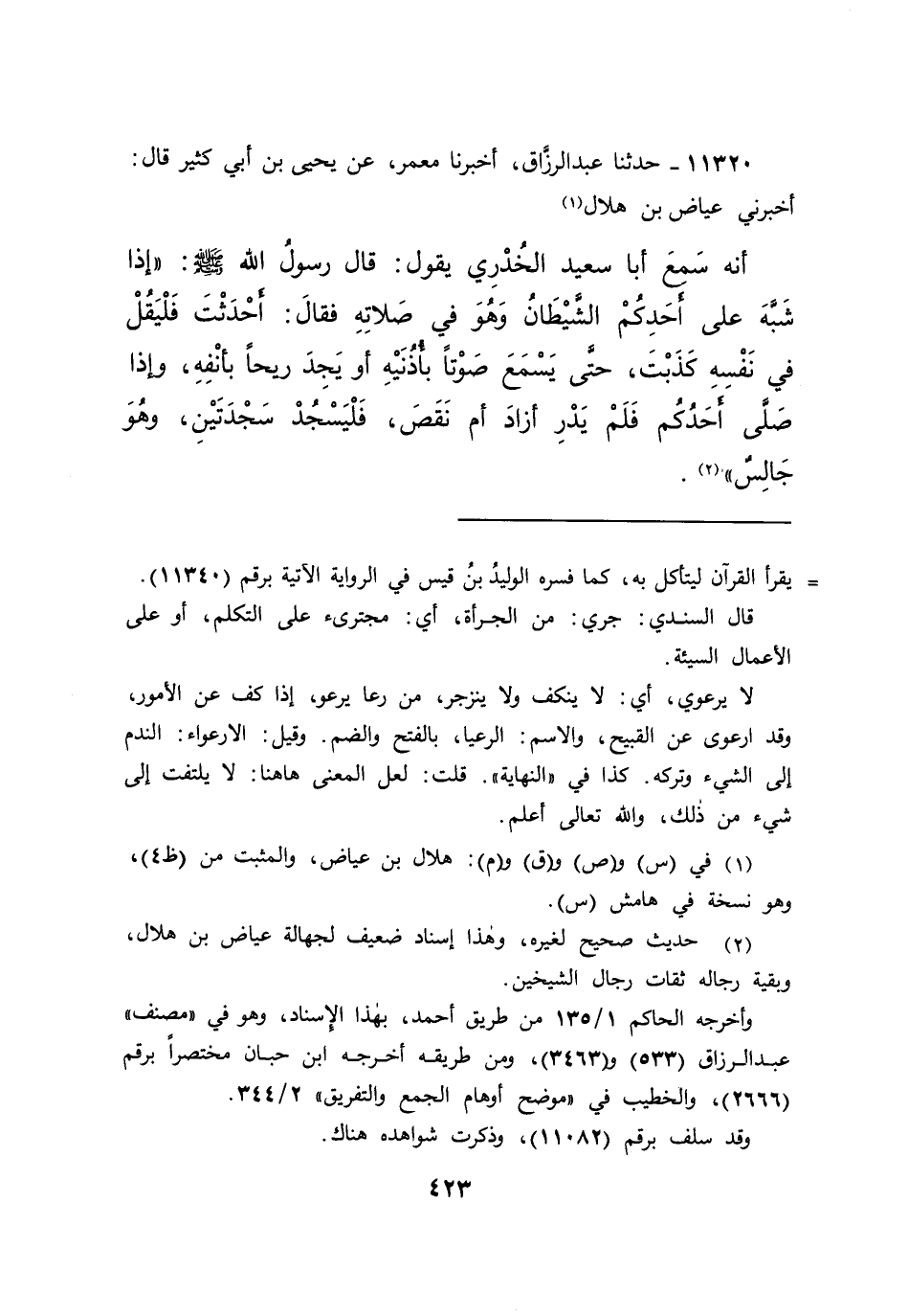 ١١٣٢٠ - حَدَّثَنَا عَبْدُ الرَّزَّاقِ، أَخْبَرَنَا مَعْمَرٌ، عَنْ يَحْيَى بْنِ أَبِي كَثِيرٍ، قَالَ: أَخْبَرَنِي عِيَاضُ بْنُ هِلَالٍ (١) ، أَنَّهُ سَمِعَ أَبَا سَعِيدٍ الْخُدْرِيَّ، يَقُولُ: قَالَ رَسُولُ اللهِ صَلَّى اللهُ عَلَيْهِ وَسَلَّمَ: " إِذَا شَبَّهَ عَلَى أَحَدِكُمُ الشَّيْطَانُ وَهُوَ فِي صَلَاتِهِ، فَقَالَ: أَحْدَثْتَ، فَلْيَقُلْ فِي نَفْسِهِ كَذَبْتَ، حَتَّى يَسْمَعَ صَوْتًا بِأُذُنَيْهِ، أَوْ يَجِدَ رِيحًا بِأَنْفِهِ، وَإِذَا صَلَّى أَحَدُكُمْ فَلَمْ يَدْرِ أَزَادَ أَمْ نَقَصَ، فَلْيَسْجُدْ سَجْدَتَيْنِ وَهُوَ جَالِسٌ " (٢)