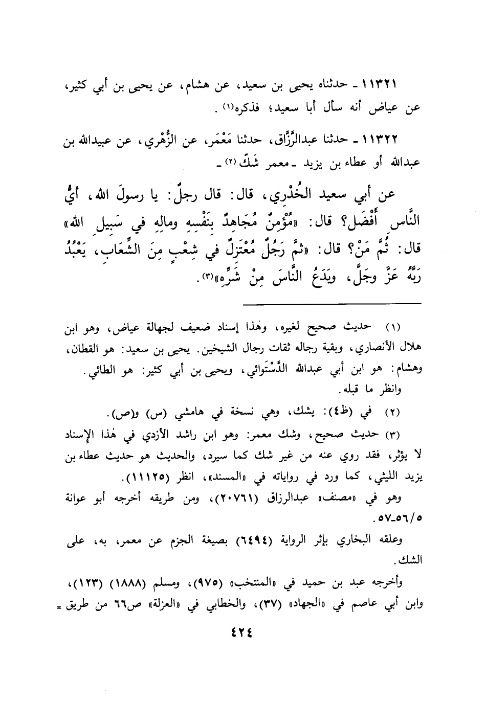 ١١٣٢٢ - حَدَّثَنَا عَبْدُ الرَّزَّاقِ، حَدَّثَنَا مَعْمَرٌ، عَنِ الزُّهْرِيِّ، عَنْ عُبَيْدِ اللهِ بْنِ عَبْدِ اللهِ، أَوْ عَطَاءِ بْنِ يَزِيدَ - مَعْمَرٌ شَكَّ (٢) - عَنْ أَبِي سَعِيدٍ الْخُدْرِيِّ، قَالَ: قَالَ رَجُلٌ: يَا رَسُولَ اللهِ أَيُّ النَّاسِ أَفْضَلُ؟ قَالَ: " مُؤْمِنٌ مُجَاهِدٌ بِنَفْسِهِ وَمَالِهِ فِي سَبِيلِ اللهِ " قَالَ: ثُمَّ مَنْ، قَالَ: " ثُمَّ رَجُلٌ مُعْتَزِلٌ فِي شِعْبٍ مِنَ الشِّعَابِ، يَعْبُدُ رَبَّهُ عَزَّ وَجَلَّ، وَيَدَعُ النَّاسَ مِنْ شَرِّهِ " (٣)