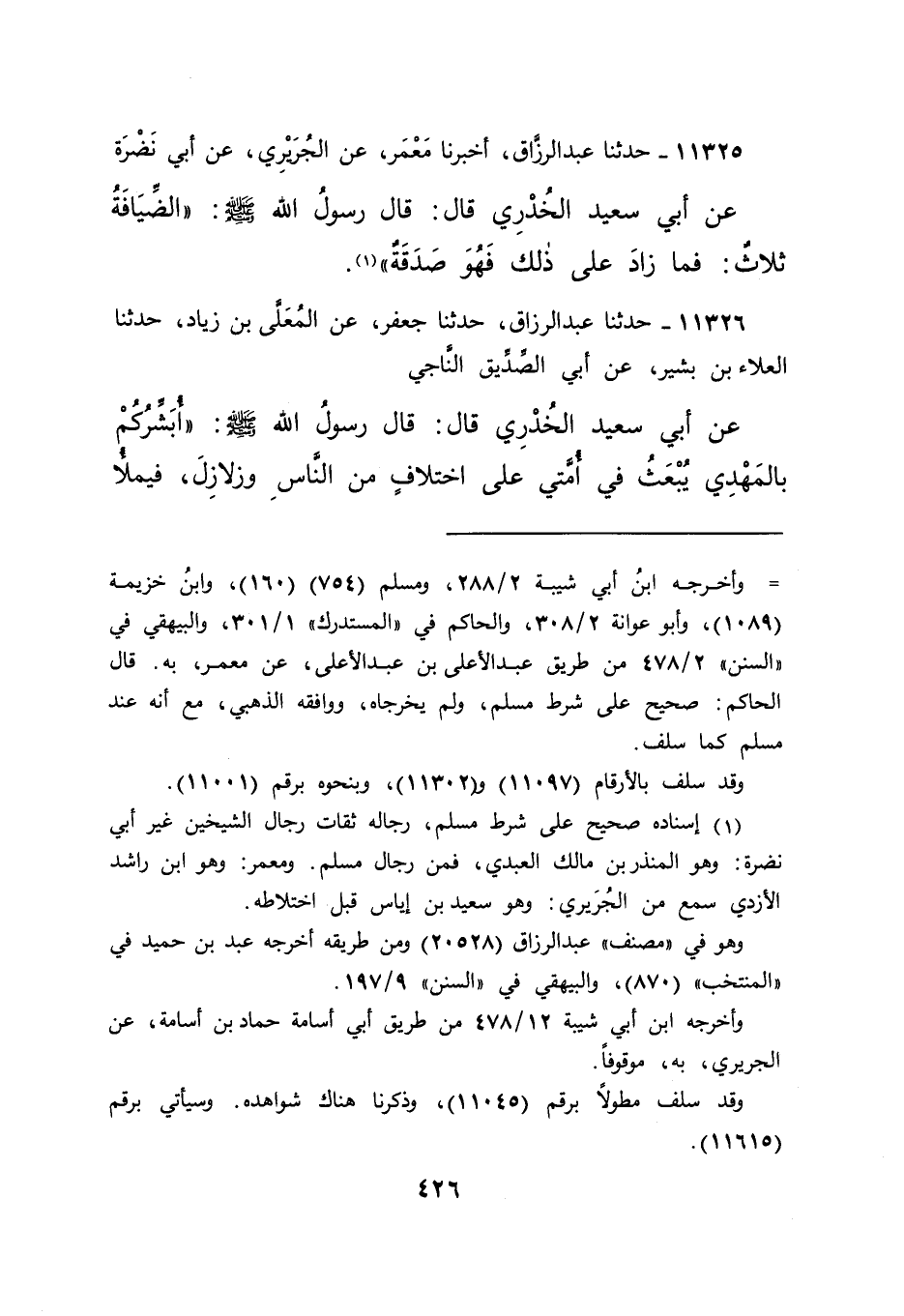 ١١٣٢٥ - حَدَّثَنَا عَبْدُ الرَّزَّاقِ، أَخْبَرَنَا مَعْمَرٌ، عَنِ الْجُرَيْرِيِّ، عَنْ أَبِي نَضْرَةَ، عَنْ أَبِي سَعِيدٍ الْخُدْرِيِّ، قَالَ: قَالَ رَسُولُ اللهِ صَلَّى اللهُ عَلَيْهِ وَسَلَّمَ: " الضِّيَافَةُ ثَلَاثٌ فَمَا زَادَ عَلَى ذَلِكَ فَهُوَ صَدَقَةٌ " (١)
