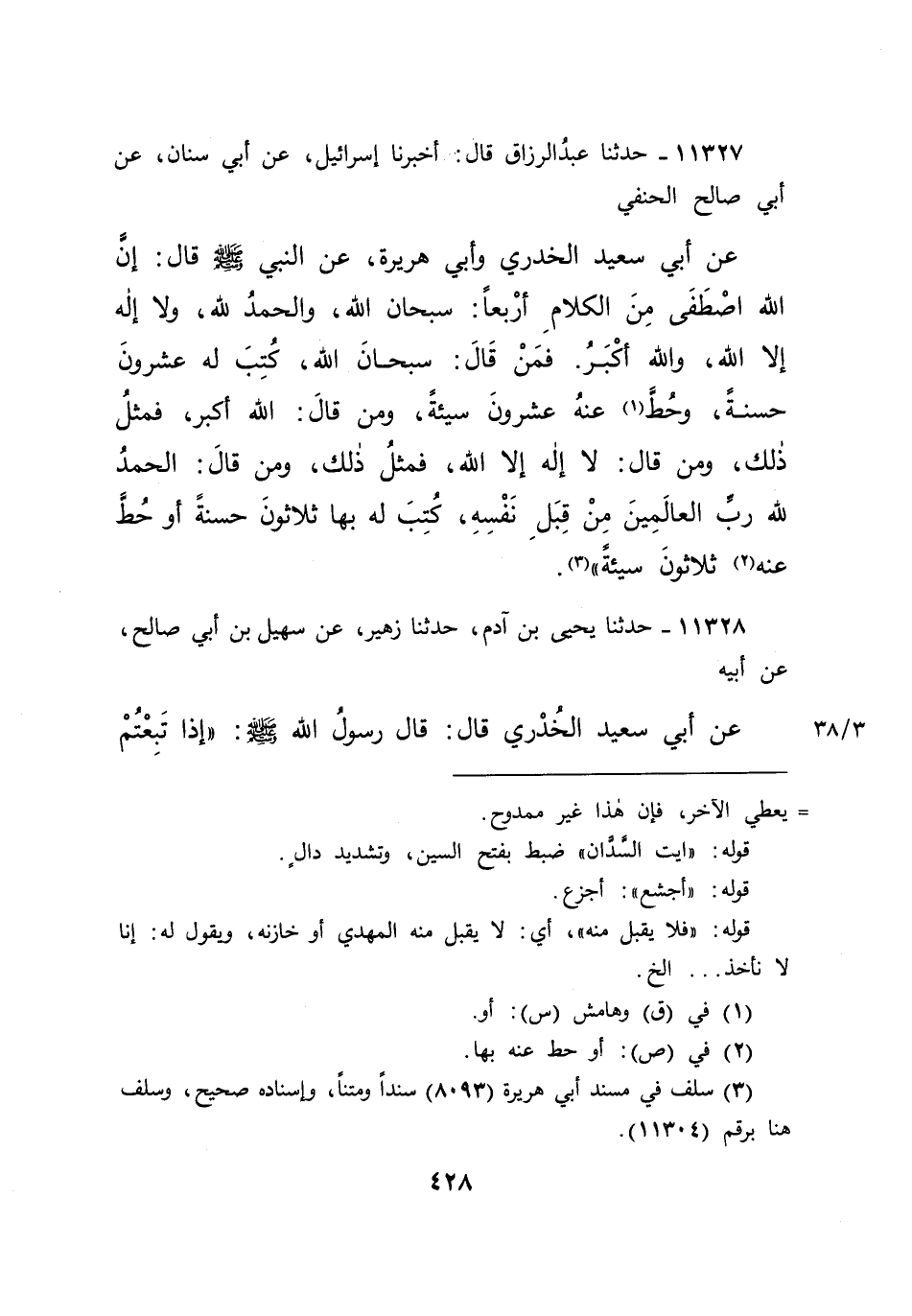 ١١٣٢٧ - حَدَّثَنَا عَبْدُ الرَّزَّاقِ، قَالَ: أَخْبَرَنَا إِسْرَائِيلُ، عَنْ أَبِي سِنَانٍ، عَنْ أَبِي صَالِحٍ الْحَنَفِيِّ، عَنْ أَبِي سَعِيدٍ الْخُدْرِيِّ، وَأَبِي هُرَيْرَةَ، عَنِ النَّبِيِّ صَلَّى اللهُ عَلَيْهِ وَسَلَّمَ قَالَ: " إِنَّ اللهَ اصْطَفَى مِنَ الْكَلَامِ أَرْبَعًا: سُبْحَانَ اللهِ، وَالْحَمْدُ لِلَّهِ، وَلَا إِلَهَ إِلَّا اللهُ، وَاللهُ أَكْبَرُ فَمَنْ قَالَ: سُبْحَانَ اللهِ كُتِبَ لَهُ عِشْرُونَ حَسَنَةً وَحُطَّ (١) عَنْهُ عِشْرُونَ سَيِّئَةً، وَمَنْ قَالَ: اللهُ أَكْبَرُ فَمِثْلُ ذَلِكَ، وَمَنْ قَالَ: لَا إِلَهَ إِلَّا اللهُ فَمِثْلُ ذَلِكَ، وَمَنْ قَالَ: الْحَمْدُ لِلَّهِ رَبِّ الْعَالَمِينَ مِنْ قِبَلِ نَفْسِهِ كُتِبَ لَهُ بِهَا ثَلَاثُونَ حَسَنَةً، أَوْ حُطَّ عَنْهُ (٢) ثَلَاثُونَ سَيِّئَةً " (٣)