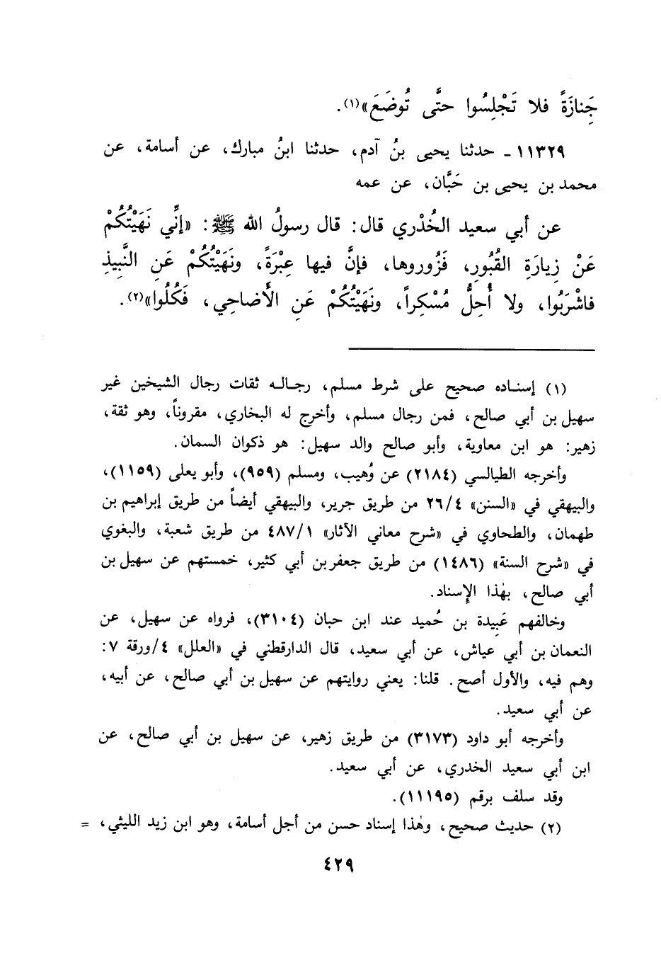 ١١٣٢٩ - حَدَّثَنَا يَحْيَى بْنُ آدَمَ، حَدَّثَنَا ابْنُ مُبَارَكٍ، عَنْ أُسَامَةَ، عَنْ مُحَمَّدِ بْنِ يَحْيَى بْنِ حَبَّانَ، عَنْ عَمِّهِ، عَنْ أَبِي سَعِيدٍ الْخُدْرِيِّ، قَالَ: قَالَ رَسُولُ اللهِ صَلَّى اللهُ عَلَيْهِ وَسَلَّمَ: " إِنِّي نَهَيْتُكُمْ عَنْ زِيَارَةِ الْقُبُورِ فَزُورُوهَا، فَإِنَّ فِيهَا عِبْرَةً، وَنَهَيْتُكُمْ عَنِ النَّبِيذِ فَاشْرَبُوا، وَلَا أُحِلُّ مُسْكِرًا، وَنَهَيْتُكُمْ عَنِ الْأَضَاحِيِّ فَكُلُوا " (٢)
