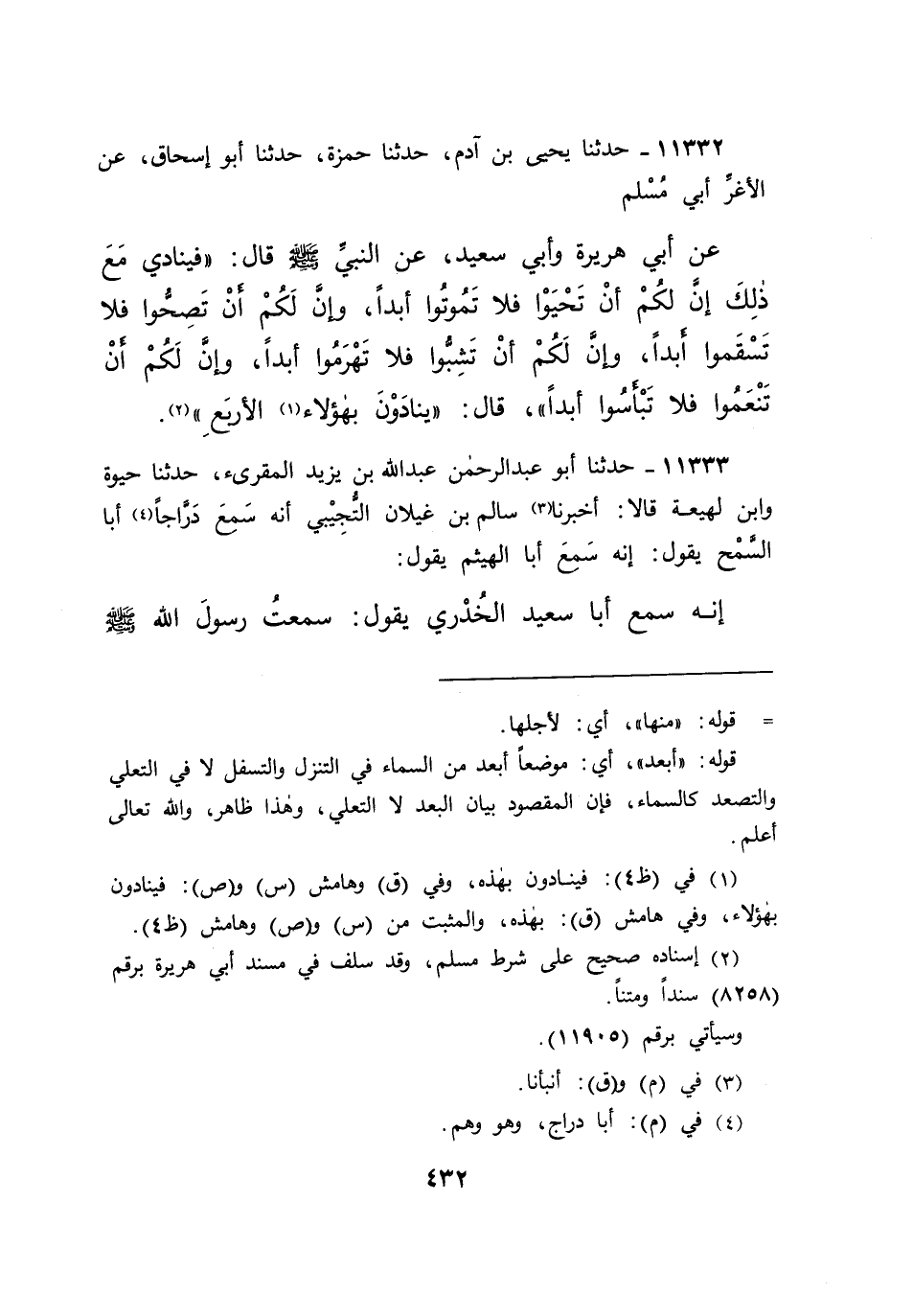 ١١٣٣٢ - حَدَّثَنَا يَحْيَى بْنُ آدَمَ، حَدَّثَنَا حَمْزَةُ، حَدَّثَنَا أَبُو إِسْحَاقَ، عَنِ الْأَغَرِّ أَبِي مُسْلِمٍ، عَنْ أَبِي هُرَيْرَةَ، وَأَبِي سَعِيدٍ، عَنِ النَّبِيِّ صَلَّى اللهُ عَلَيْهِ وَسَلَّمَ قَالَ: فَيُنَادَى مَعَ ذَلِكَ: " إِنَّ لَكُمْ أَنْ تَحْيَوْا، فَلَا تَمُوتُوا أَبَدًا، وَإِنَّ لَكُمْ أَنْ تَصِحُّوا فَلَا تَسْقَمُوا أَبَدًا، وَإِنَّ لَكُمْ أَنْ تَشِبُّوا فَلَا تَهْرَمُوا أَبَدًا، وَإِنَّ لَكُمْ أَنْ تَنْعَمُوا فَلَا تَبْأَسُوا أَبَدًا "، قَالَ: " يُنَادَوْنَ بِهَؤُلَاءِ (١) الْأَرْبَعِ " (٢)