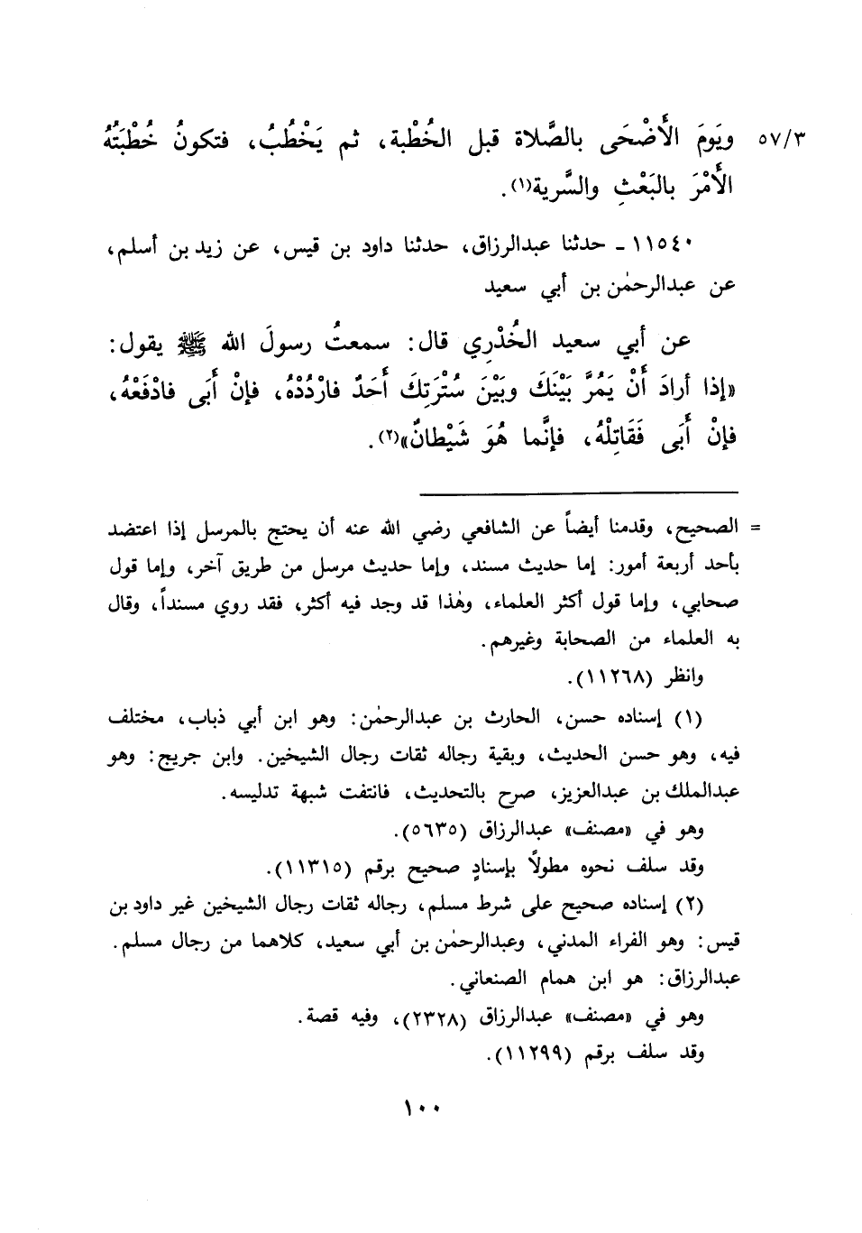 ١١٥٤٠ - حَدَّثَنَا عَبْدُ الرَّزَّاقِ، حَدَّثَنَا دَاوُدُ بْنُ قَيْسٍ، عَنْ زَيْدِ بْنِ أَسْلَمَ، عَنْ عَبْدِ الرَّحْمَنِ بْنِ أَبِي سَعِيدٍ، عَنْ أَبِي سَعِيدٍ الْخُدْرِيِّ قَالَ: سَمِعْتُ رَسُولَ اللهِ صَلَّى اللهُ عَلَيْهِ وَسَلَّمَ يَقُولُ: " إِذَا أَرَادَ أَنْ يَمُرَّ بَيْنَكَ وَبَيْنَ سُتْرَتِكَ أَحَدٌ فَارْدُدْهُ، فَإِنْ أَبَى فَادْفَعْهُ، فَإِنْ أَبَى فَقَاتِلْهُ، فَإِنَّمَا هُوَ شَيْطَانٌ " (٢)