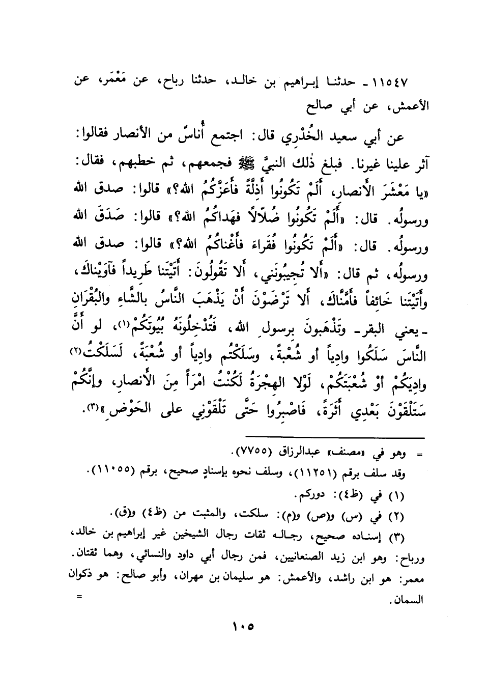 ١١٥٤٧ - حَدَّثَنَا إِبْرَاهِيمُ بْنُ خَالِدٍ، حَدَّثَنَا رَبَاحٌ، عَنْ مَعْمَرٍ، عَنْ الْأَعْمَشِ، عَنْ أَبِي صَالِحٍ، عَنْ أَبِي سَعِيدٍ الْخُدْرِيِّ قَالَ: اجْتَمَعَ أُنَاسٌ مِنَ الْأَنْصَارِ فَقَالُوا: آثَرَ عَلَيْنَا غَيْرَنَا، فَبَلَغَ ذَلِكَ النَّبِيَّ صَلَّى اللهُ عَلَيْهِ وَسَلَّمَ فَجَمَعَهُمْ، ثُمَّ خَطَبَهُمْ، فَقَالَ: " يَا مَعْشَرَ الْأَنْصَارِ، أَلَمْ تَكُونُوا أَذِلَّةً فَأَعَزَّكُمُ اللهُ؟ " قَالُوا: صَدَقَ اللهُ وَرَسُولُهُ، قَالَ: " أَلَمْ تَكُونُوا ضُلَّالًا، فَهَدَاكُمُ اللهُ؟ " قَالُوا: صَدَقَ اللهُ وَرَسُولُهُ، قَالَ: " أَلَمْ تَكُونُوا فُقَرَاءَ، فَأَغْنَاكُمُ اللهُ؟ " قَالُوا: صَدَقَ اللهُ وَرَسُولُهُ، ثُمَّ قَالَ: " أَلَا تُجِيبُونَنِي؟ أَلَا تَقُولُونَ: أَتَيْتَنَا طَرِيدًا فَآوَيْنَاكَ، وَأَتَيْتَنَا خَائِفًا فَآمَنَّاكَ، أَلَا تَرْضَوْنَ أَنْ يَذْهَبَ النَّاسُ بِالشَّاءِ وَالْبُقْرَانِ، - يَعْنِي الْبَقَرَ - وَتَذْهَبُونَ بِرَسُولِ اللهِ، فَتُدْخِلُونَهُ بُيُوتَكُمْ (١) ، لَوْ أَنَّ النَّاسَ سَلَكُوا وَادِيًا أَوْ شُعْبَةً، وَسَلَكْتُمْ وَادِيًا أَوْ شُعْبَةً لَسَلَكْتُ (٢) وَادِيَكُمْ أَوْ شُعْبَتَكُمْ، لَوْلَا الْهِجْرَةُ لَكُنْتُ امْرَأً مِنَ الْأَنْصَارِ، وَإِنَّكُمْ سَتَلْقَوْنَ بَعْدِي أَثَرَةً، فَاصْبِرُوا، حَتَّى تَلْقَوْنِي، عَلَى الْحَوْضِ " (٣)