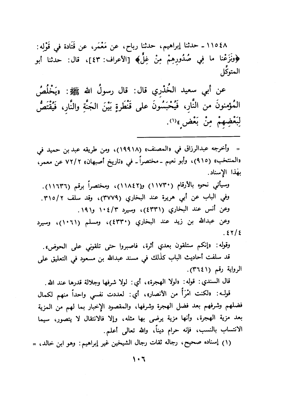 ١١٥٤٨ - حَدَّثَنَا إِبْرَاهِيمُ، حَدَّثَنَا رَبَاحٌ، عَنْ مَعْمَرٍ، عَنْ قَتَادَةَ فِي قَوْلِهِ: {وَنَزَعْنَا مَا فِي صُدُورِهِمْ مِنْ غِلٍّ} [الأعراف: ٤٣] قَالَ: حَدَّثَنَا أَبُو الْمُتَوَكِّلِ، عَنْ أَبِي سَعِيدٍ الْخُدْرِيِّ قَالَ: قَالَ رَسُولُ اللهِ صَلَّى اللهُ عَلَيْهِ وَسَلَّمَ: " يَخْلُصُ الْمُؤْمِنُونَ مِنَ النَّارِ، فَيُحْبَسُونَ عَلَى قَنْطَرَةٍ بَيْنَ الْجَنَّةِ وَالنَّارِ، فَيُقْتَصُّ لِبَعْضِهِمْ مِنْ بَعْضٍ " (١)