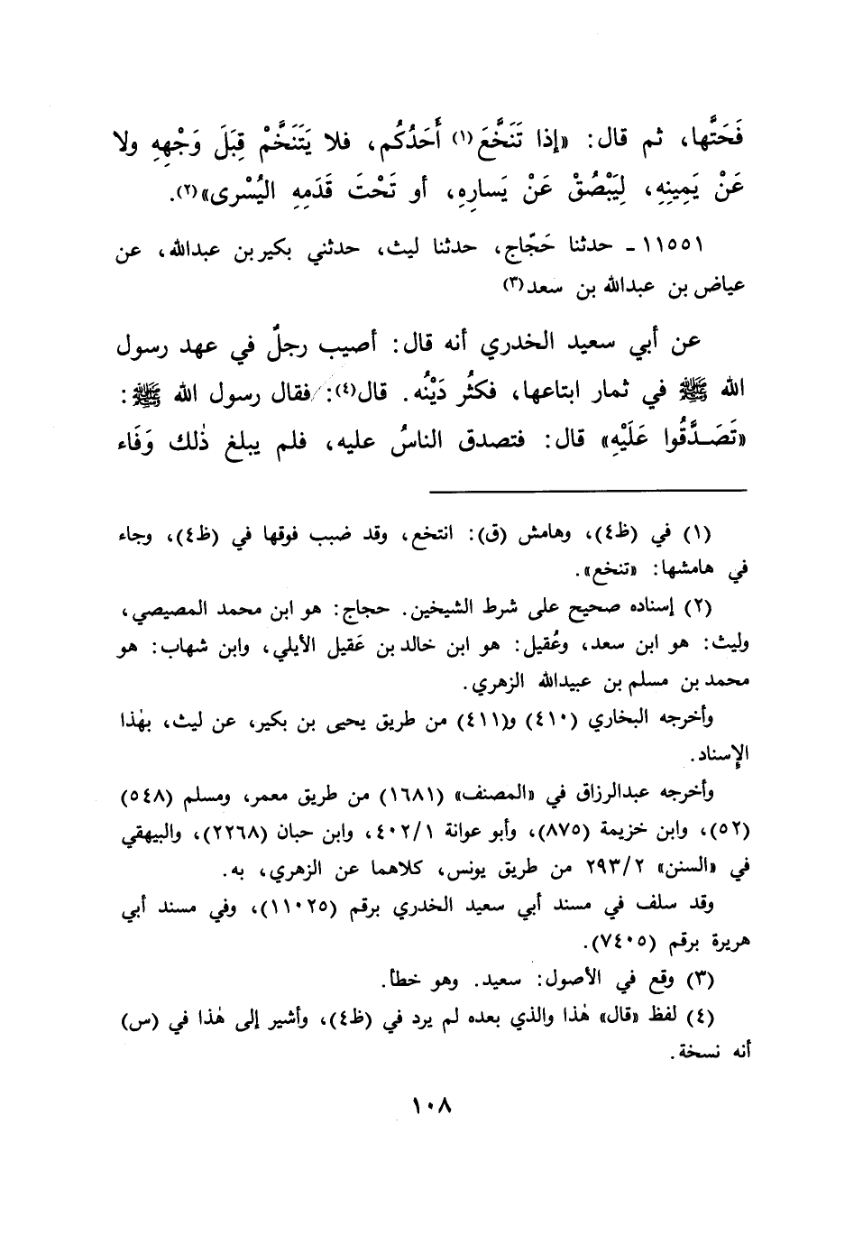 ١١٥٥١ - حَدَّثَنَا حَجَّاجٌ، حَدَّثَنَا لَيْثٌ، حَدَّثَنِي بُكَيْرُ بْنُ عَبْدِ اللهِ، عَنْ عِيَاضِ بْنِ عَبْدِ اللهِ بْنِ سَعْدٍ، (٣) عَنْ أَبِي سَعِيدٍ الْخُدْرِيِّ أَنَّهُ قَالَ: أُصِيبَ رَجُلٌ فِي عَهْدِ رَسُولِ اللهِ صَلَّى اللهُ عَلَيْهِ وَسَلَّمَ فِي ثِمَارٍ ابْتَاعَهَا فَكَثُرَ دَيْنُهُ، قَالَ (٤) : فَقَالَ رَسُولُ اللهِ صَلَّى اللهُ عَلَيْهِ وَسَلَّمَ: " تَصَدَّقُوا عَلَيْهِ " قَالَ: فَتَصَدَّقَ النَّاسُ عَلَيْهِ، فَلَمْ يَبْلُغْ ذَلِكَ وَفَاءَ