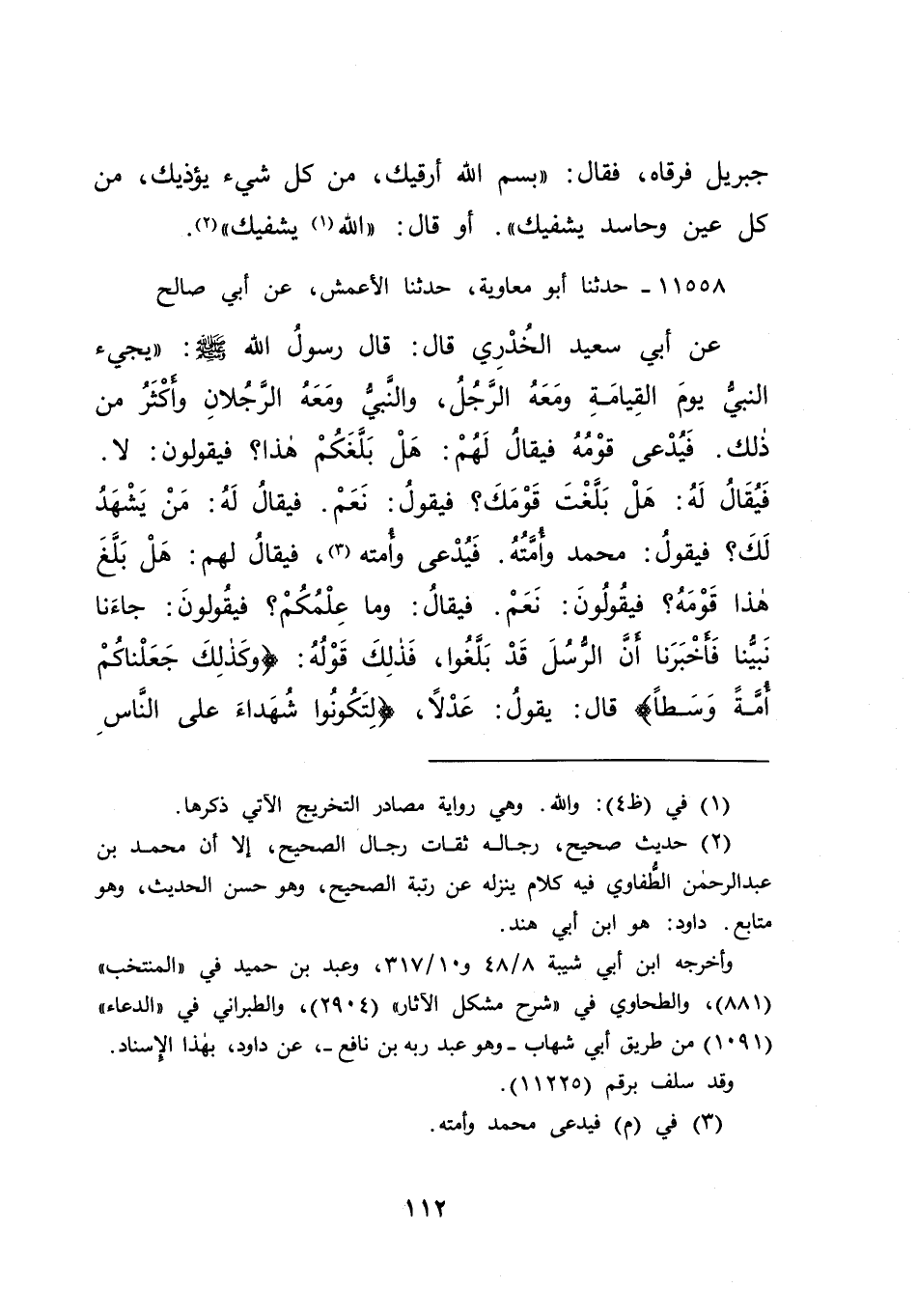 ١١٥٥٨ - حَدَّثَنَا أَبُو مُعَاوِيَةَ، حَدَّثَنَا الْأَعْمَشُ، عَنْ أَبِي صَالِحٍ، عَنْ أَبِي سَعِيدٍ الْخُدْرِيِّ قَالَ: قَالَ رَسُولُ اللهِ صَلَّى اللهُ عَلَيْهِ وَسَلَّمَ: " يَجِيءُ النَّبِيُّ يَوْمَ الْقِيَامَةِ، وَمَعَهُ الرَّجُلُ، وَالنَّبِيُّ وَمَعَهُ الرَّجُلَانِ، وَأَكْثَرُ مِنْ ذَلِكَ، فَيُدْعَى قَوْمُهُ، فَيُقَالُ لَهُمْ: هَلْ بَلَّغَكُمْ هَذَا؟ فَيَقُولُونَ: لَا. فَيُقَالُ لَهُ: هَلْ بَلَّغْتَ قَوْمَكَ؟ فَيَقُولُ: نَعَمْ. فَيُقَالُ لَهُ: مَنْ يَشْهَدُ لَكَ؟ فَيَقُولُ: مُحَمَّدٌ وَأُمَّتُهُ. فَيُدْعَى وَأُمَّتُهُ (٣) ، فَيُقَالُ لَهُمْ: هَلْ بَلَّغَ هَذَا قَوْمَهُ؟ فَيَقُولُونَ: نَعَمْ. فَيُقَالُ: وَمَا عِلْمُكُمْ؟ فَيَقُولُونَ: جَاءَنَا نَبِيُّنَا، فَأَخْبَرَنَا: أَنَّ الرُّسُلَ قَدْ بَلَّغُوا، فَذَلِكَ قَوْلُهُ ": {وَكَذَلِكَ جَعَلْنَاكُمْ أُمَّةً وَسَطًا} [البقرة: ١٤٣] قَالَ: " يَقُولُ: عَدْلًا "، {لِتَكُونُوا شُهَدَاءَ عَلَى النَّاسِ،