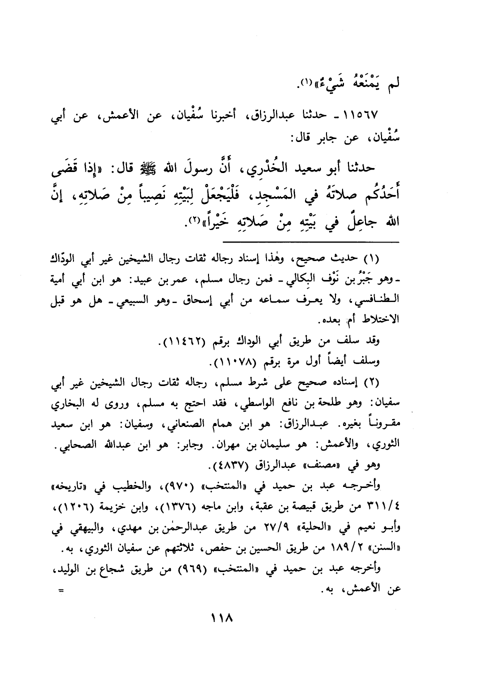 ١١٥٦٧ - حَدَّثَنَا عَبْدُ الرَّزَّاقِ، أَخْبَرَنَا سُفْيَانُ، عَنِ الْأَعْمَشِ، عَنْ أَبِي سُفْيَانَ، عَنْ جَابِرٍ قَالَ: حَدَّثَنَا أَبُو سَعِيدٍ الْخُدْرِيُّ، أَنَّ رَسُولَ اللهِ صَلَّى اللهُ عَلَيْهِ وَسَلَّمَ قَالَ: " إِذَا قَضَى أَحَدُكُمْ صَلَاتَهُ فِي الْمَسْجِدِ، فَلْيَجْعَلْ لِبَيْتِهِ نَصِيبًا مِنْ صَلَاتِهِ، إِنَّ اللهَ جَاعِلٌ فِي بَيْتِهِ مِنْ صَلَاتِهِ خَيْرًا " (٢)