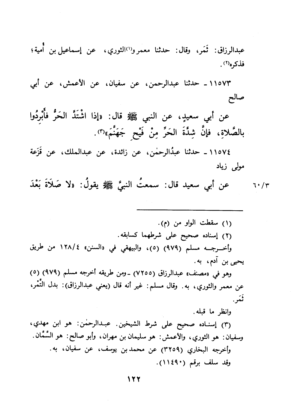 ١١٥٧٣ - حَدَّثَنَا عَبْدُ الرَّحْمَنِ، عَنْ سُفْيَانَ، عَنِ الْأَعْمَشِ، عَنْ أَبِي صَالِحٍ، عَنْ أَبِي سَعِيدٍ، عَنِ النَّبِيِّ صَلَّى اللهُ عَلَيْهِ وَسَلَّمَ قَالَ: " إِذَا اشْتَدَّ الْحَرُّ فَأَبْرِدُوا بِالصَّلَاةِ، فَإِنَّ شِدَّةَ الْحَرِّ مِنْ فَيْحِ جَهَنَّمَ " (٣)