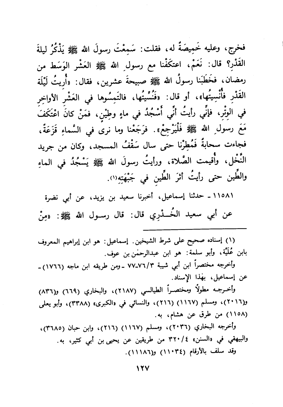 فَخَرَجَ وَعَلَيْهِ خَمِيصَةٌ لَهُ، فَقُلْتُ: سَمِعْتَ رَسُولَ اللهِ صَلَّى اللهُ عَلَيْهِ وَسَلَّمَ يَذْكُرُ لَيْلَةَ الْقَدْرِ، قَالَ: نَعَمْ. اعْتَكَفْنَا مَعَ رَسُولِ اللهِ صَلَّى اللهُ عَلَيْهِ وَسَلَّمَ الْعَشْرَ الْوَسَطَ مِنْ رَمَضَانَ، فَخَطَبَنَا رَسُولُ اللهِ صَلَّى اللهُ عَلَيْهِ وَسَلَّمَ صَبِيحَةَ عِشْرِينَ، فَقَالَ: " أُرِيتُ لَيْلَةَ الْقَدْرِ، فَأُنْسِيتُهَا - أَوْ قَالَ: فَنَسِيتُهَا - فَالْتَمِسُوهَا فِي الْعَشْرِ الْأَوَاخِرِ فِي الْوَتْرِ، فَإِنِّي رَأَيْتُ أَنِّي أَسْجُدُ فِي مَاءٍ وَطِينٍ، فَمَنْ كَانَ اعْتَكَفَ مَعَ رَسُولِ اللهِ صَلَّى اللهُ عَلَيْهِ وَسَلَّمَ فَلْيَرْجِعْ "، فَرَجَعْنَا وَمَا نَرَى فِي السَّمَاءِ قَزَعَةً، فَجَاءَتْ سَحَابَةٌ فَمُطِرْنَا، حَتَّى سَالَ سَقْفُ الْمَسْجِدِ، وَكَانَ مِنْ جَرِيدِ النَّخْلِ، وَأُقِيمَتِ الصَّلَاةُ، وَرَأَيْتُ رَسُولَ اللهِ صَلَّى اللهُ عَلَيْهِ وَسَلَّمَ يَسْجُدُ فِي الْمَاءِ وَالطِّينِ، حَتَّى رَأَيْتُ أَثَرَ الطِّينِ فِي جَبْهَتِهِ (١)