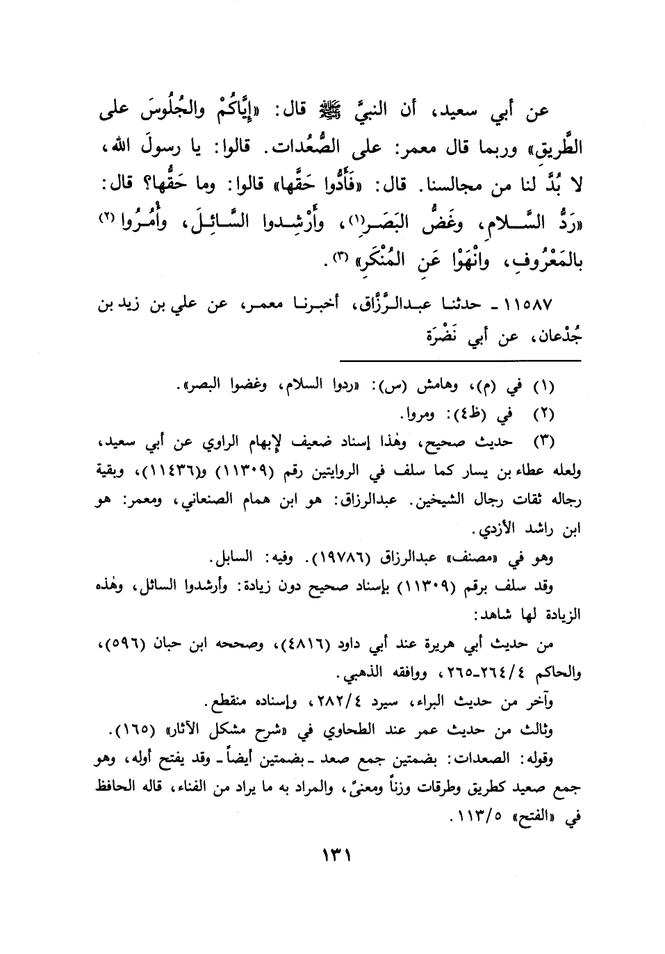 عَنْ أَبِي سَعِيدٍ أَنَّ النَّبِيَّ صَلَّى اللهُ عَلَيْهِ وَسَلَّمَ قَالَ: " إِيَّاكُمْ وَالْجُلُوسَ عَلَى الطَّرِيقِ " - وَرُبَّمَا قَالَ مَعْمَرٌ: عَلَى الصُّعُدَاتِ - قَالُوا: يَا رَسُولَ اللهِ، لَا بُدَّ لَنَا مِنْ مَجَالِسِنَا، قَالَ: " فَأَدُّوا حَقَّهَا " قَالُوا: وَمَا حَقُّهَا؟ قَالَ: " رُدُّوا السَّلَامَ، وَغُضُّوا الْبَصَرَ (١) ، وَأَرْشِدُوا السَّائِلَ، وَأْمُرُوا (٢) بِالْمَعْرُوفِ، وَانْهَوْا عَنِ الْمُنْكَرِ " (٣)