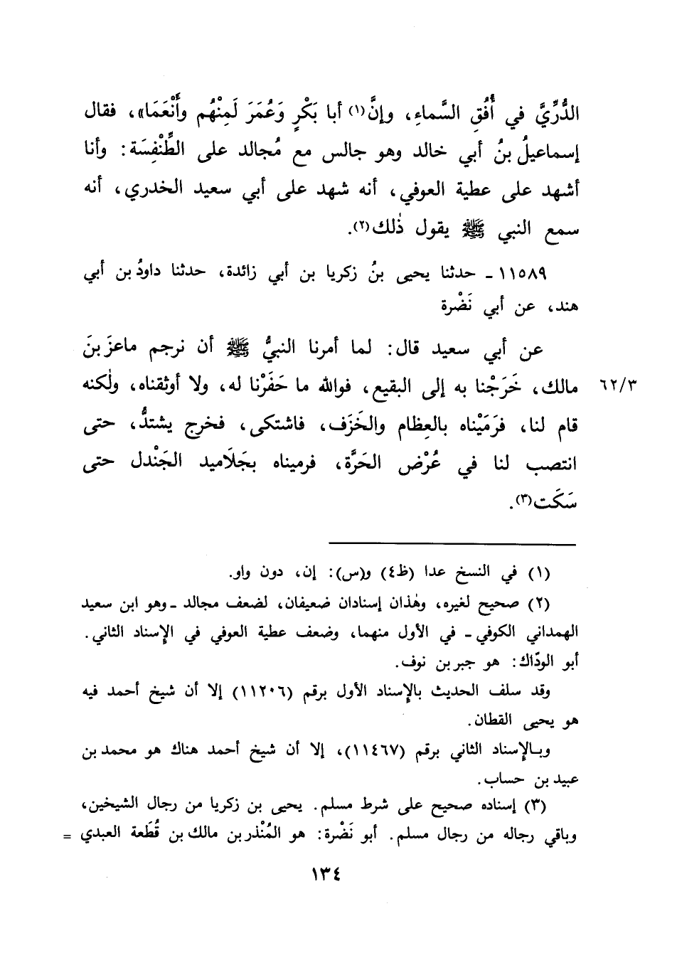 الدُّرِّيَّ فِي أُفُقِ السَّمَاءِ، وإنَّ (١) أَبَا بَكْرٍ وَعُمَرَ لَمِنْهُمْ وَأَنْعَمَا " فَقَالَ إِسْمَاعِيلُ بْنُ أَبِي خَالِدٍ: وَهُوَ جَالِسٌ مَعَ مُجَالِدٍ عَلَى الطِّنْفِسَةِ، وَأَنَا أَشْهَدُ عَلَى عَطِيَّةَ الْعَوْفِيِّ، أَنَّهُ شَهِدَ عَلَى أَبِي سَعِيدٍ الْخُدْرِيِّ أَنَّهُ سَمِعَ النَّبِيَّ صَلَّى اللهُ عَلَيْهِ وَسَلَّمَ يَقُولُ ذَلِكَ (٢)