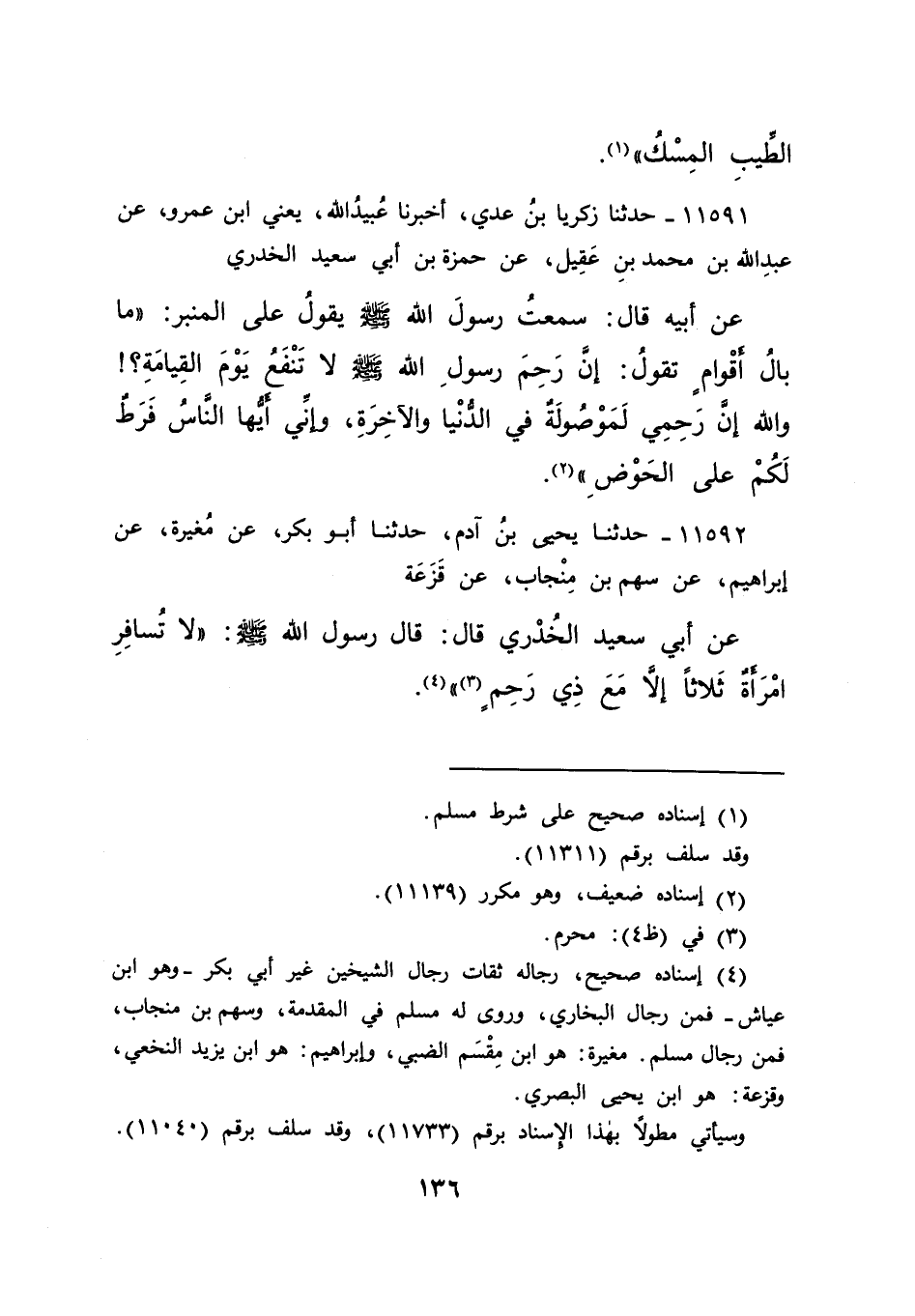 ١١٥٩٢ - حَدَّثَنَا يَحْيَى بْنُ آدَمَ، حَدَّثَنَا أَبُو بَكْرٍ، عَنْ مُغِيرَةَ، عَنْ إِبْرَاهِيمَ، عَنْ سَهْمِ بْنِ مِنْجَابٍ، عَنْ قَزَعَةَ، عَنْ أَبِي سَعِيدٍ الْخُدْرِيِّ قَالَ: قَالَ رَسُولُ اللهِ صَلَّى اللهُ عَلَيْهِ وَسَلَّمَ: " لَا تُسَافِرْ امْرَأَةٌ ثَلَاثًا، إِلَّا مَعَ ذِي رَحِمٍ (٣) " (٤)