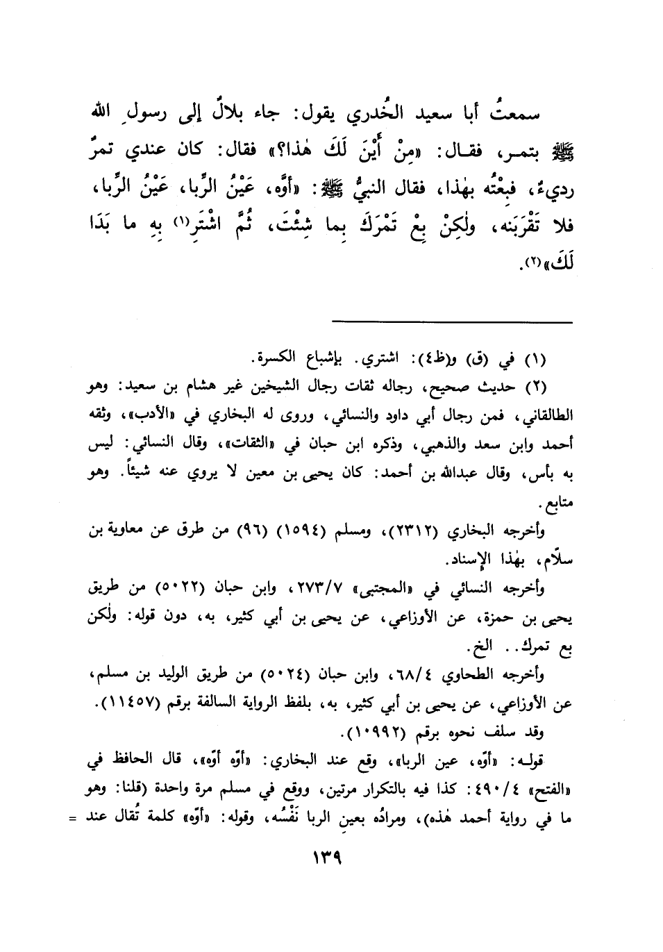 سَمِعْتُ أَبَا سَعِيدٍ الْخُدْرِيَّ يَقُولُ: جَاءَ بِلَالٌ إِلَى رَسُولِ اللهِ صَلَّى اللهُ عَلَيْهِ وَسَلَّمَ بِتَمْرٍ، فَقَالَ: " مِنْ أَيْنَ لَكَ هَذَا؟ " فَقَالَ: كَانَ عِنْدِي تَمْرٌ رَدِيءٌ فَبِعْتُهُ بِهَذَا، فَقَالَ النَّبِيُّ صَلَّى اللهُ عَلَيْهِ وَسَلَّمَ: " أَوَّهْ عَيْنُ الرِّبَا، عَيْنُ الرِّبَا، فَلَا تَقْرَبَنَّهُ، وَلَكِنْ بِعْ تَمْرَكَ، بِمَا شِئْتَ ثُمَّ اشْتَرِ (١) بِهِ مَا بَدَا لَكَ " (٢)