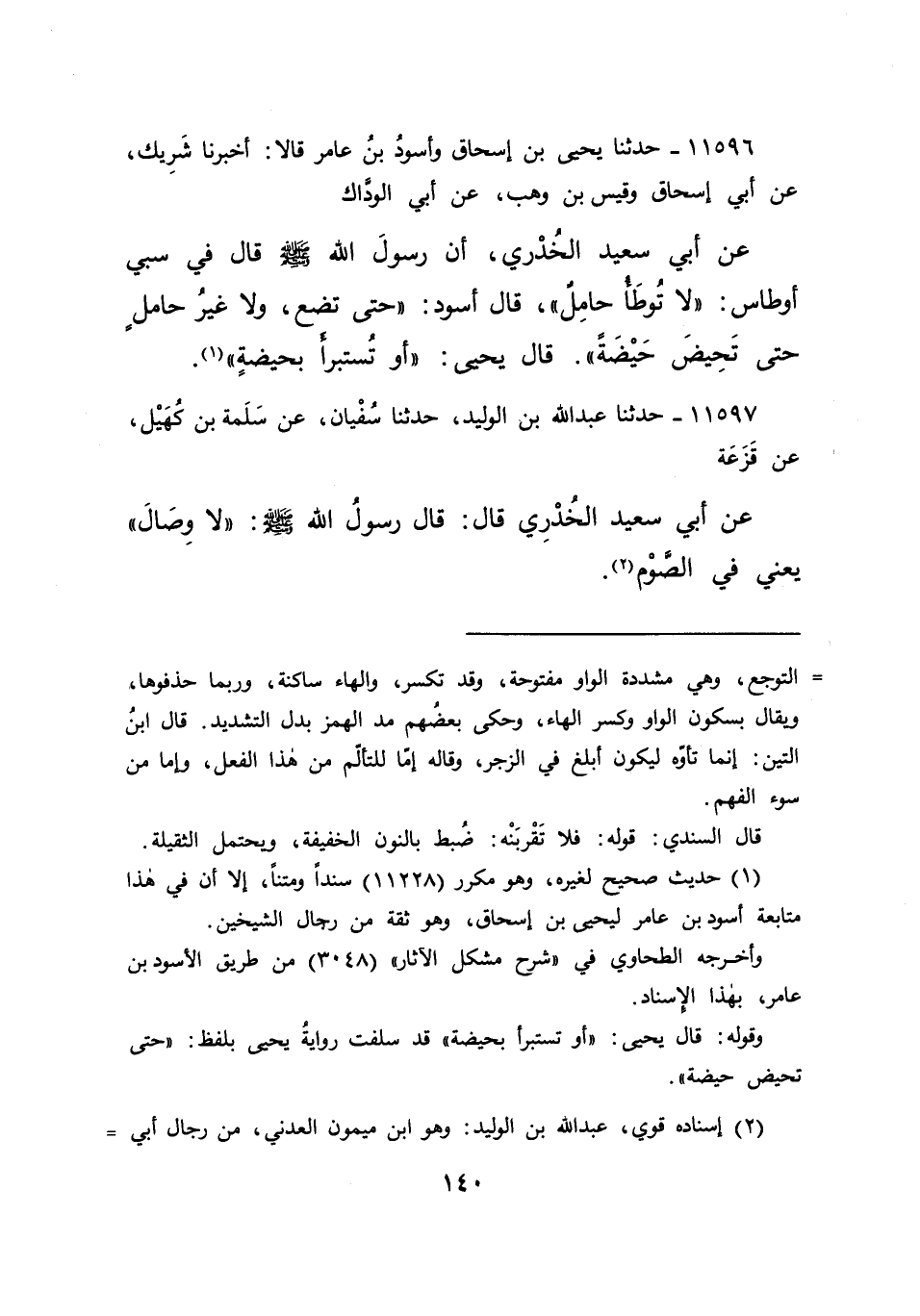 ١١٥٩٦ - حَدَّثَنَا يَحْيَى بْنُ إِسْحَاقَ، وَأَسْوَدُ بْنُ عَامِرٍ، قَالَا: أَخْبَرَنَا شَرِيكٌ، عَنْ أَبِي إِسْحَاقَ، وَقَيْسُ بْنُ وَهْبٍ، عَنْ أَبِي الْوَدَّاكِ، عَنْ أَبِي سَعِيدٍ الْخُدْرِيِّ، أَنَّ رَسُولَ اللهِ صَلَّى اللهُ عَلَيْهِ وَسَلَّمَ قَالَ فِي سَبْيِ أَوْطَاسٍ: " لَا تُوطَأُ حَامِلٌ، - قَالَ أَسْوَدُ: حَتَّى تَضَعَ - وَلَا غَيْرُ حَامِلٍ حَتَّى تَحِيضَ حَيْضَةً " قَالَ يَحْيَى: " أَوْ تُسْتَبْرَأُ بِحَيْضَةٍ " (١)