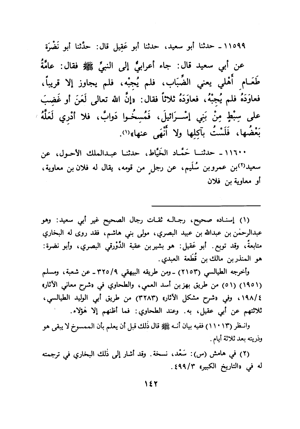 ١١٥٩٩ - حَدَّثَنَا أَبُو سَعِيدٍ، حَدَّثَنَا أَبُو عَقِيلٍ، قَالَ: حَدَّثَنَا أَبُو نَضْرَةَ، عَنْ أَبِي سَعِيدٍ قَالَ: جَاءَ أَعْرَابِيٌّ إِلَى النَّبِيِّ صَلَّى اللهُ عَلَيْهِ وَسَلَّمَ فَقَالَ: عَامَّةُ طَعَامِ أَهْلِي يَعْنِي الضِّبَابَ، فَلَمْ يُجِبْهُ، فَلَمْ يُجَاوِزْ إِلَّا قَرِيبًا، فَعَاوَدَهُ، فَلَمْ يُجِبْهُ، فَعَاوَدَهُ ثَلَاثًا، فَقَالَ: " إِنَّ اللهَ تَعَالَى لَعَنَ أَوْ غَضِبَ عَلَى سِبْطٍ مِنْ بَنِي إِسْرَائِيلَ، فَمُسِخُوا دَوَابَّ، فَلَا أَدْرِي لَعَلَّهُ بَعْضُهَا، فَلَسْتُ بِآكِلِهَا وَلَا أَنْهَى عَنْهَا " (١)