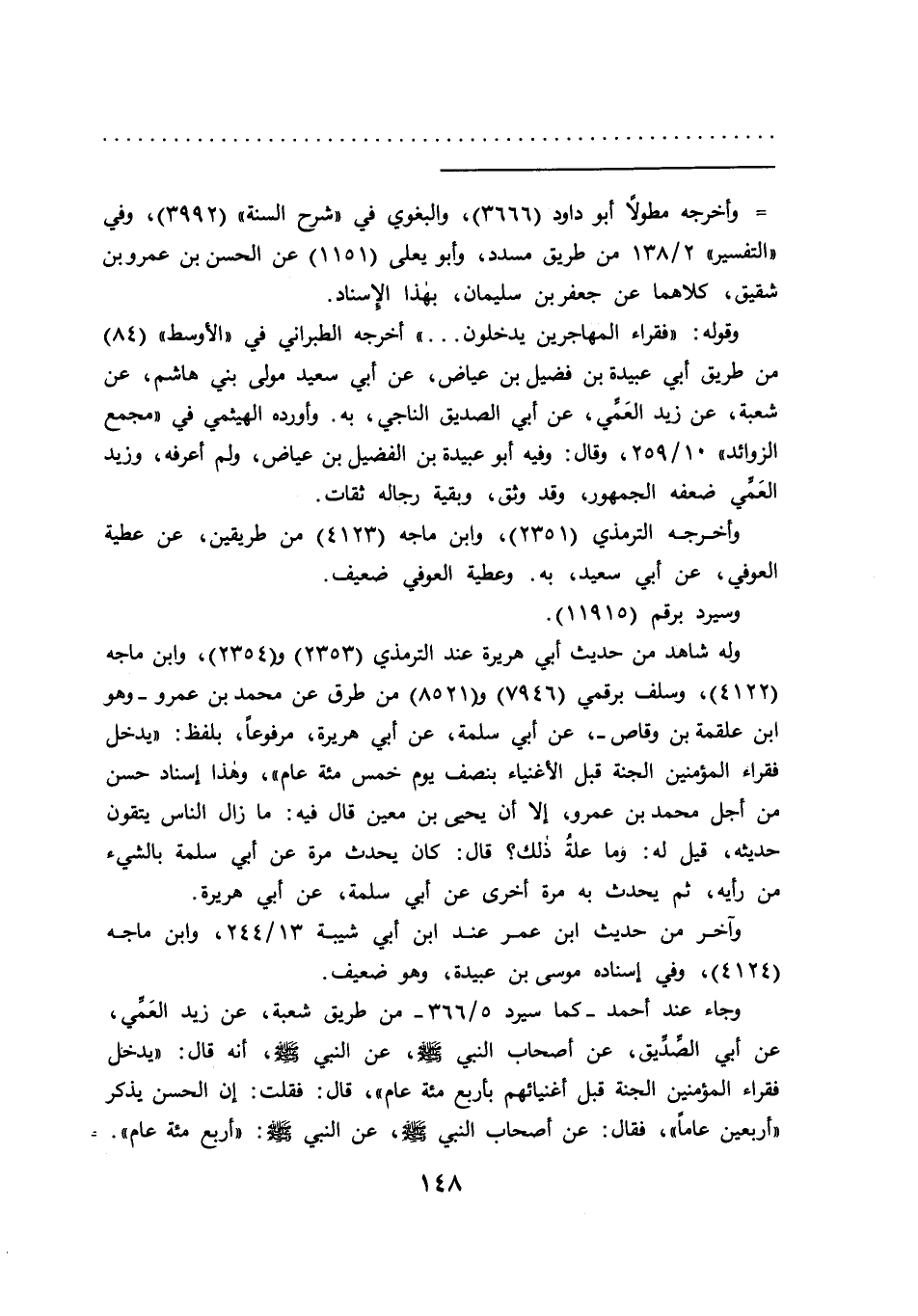 وجاء عند أحمد -كما سيرد ٥/٣٦٦- من طريق شعبة، عن زيد العَمي، عن أبي الصديق، عن أصحاب النبي صَلَّى اللهُ عَلَيْهِ وَسَلَّمَ، عن النبي صَلَّى اللهُ عَلَيْهِ وَسَلَّمَ، أنه قال: "يدخل فقراء المؤمنين الجنة قبل أغنيائهم بأربع مئة عام"، قال: فقلت: إن الحسن يذكر "أربعين عاماً"، فقال: عن أصحاب النبي صَلَّى اللهُ عَلَيْهِ وَسَلَّمَ، عن النبي صَلَّى اللهُ عَلَيْهِ وَسَلَّمَ: "أربع مئة عام". =