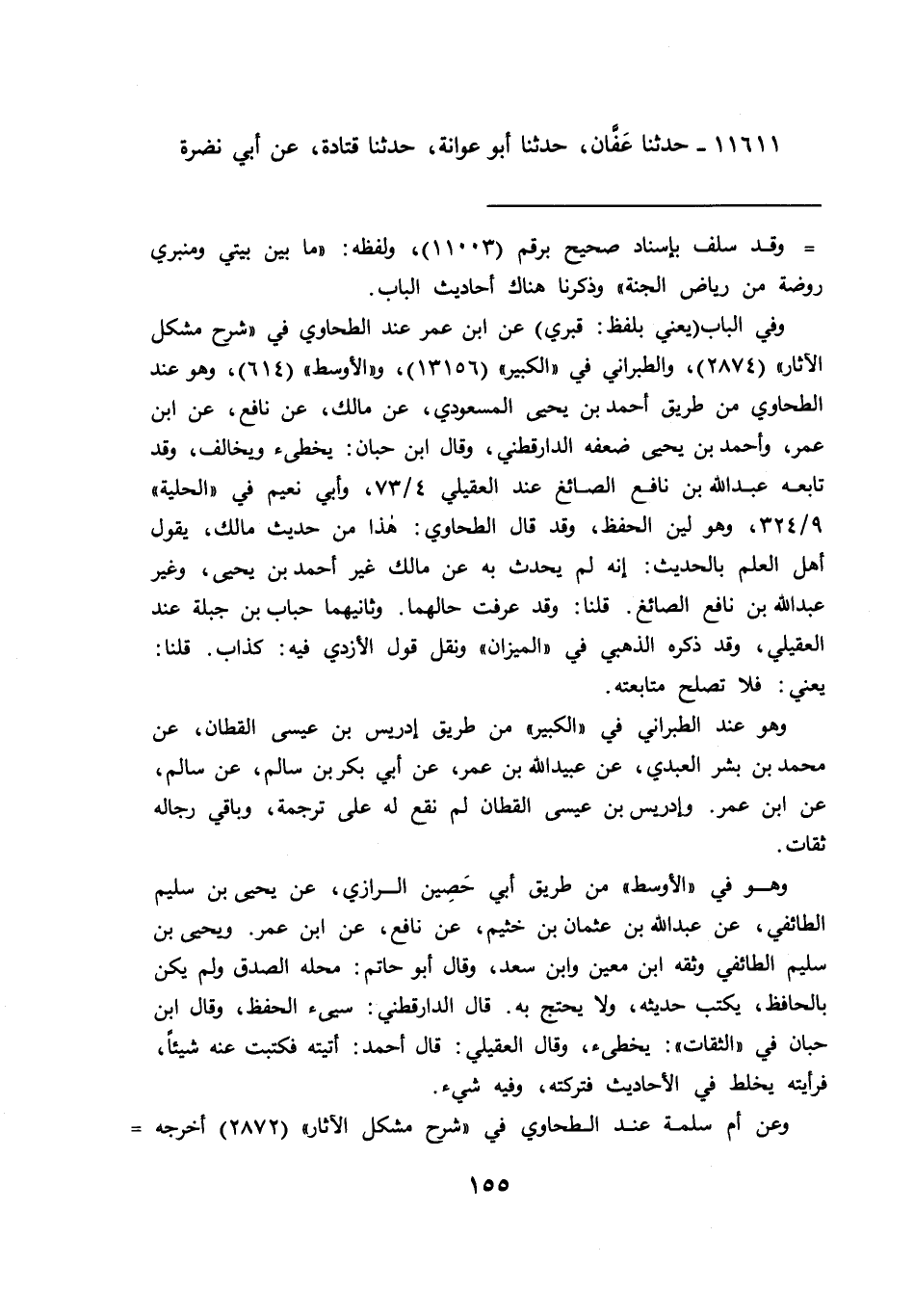وهو عند الطبراني في "الكبير" من طريق إدريس بن عيسى القطان، عن محمد بن بشر العبدي، عن عبيد الله بن عمر، عن أبي بكر بن سالم، عن سالم، عن ابن عمر. وإدريس بن عيسى القطان لم نقع له على ترجمة، وباقي رجاله ثقات.