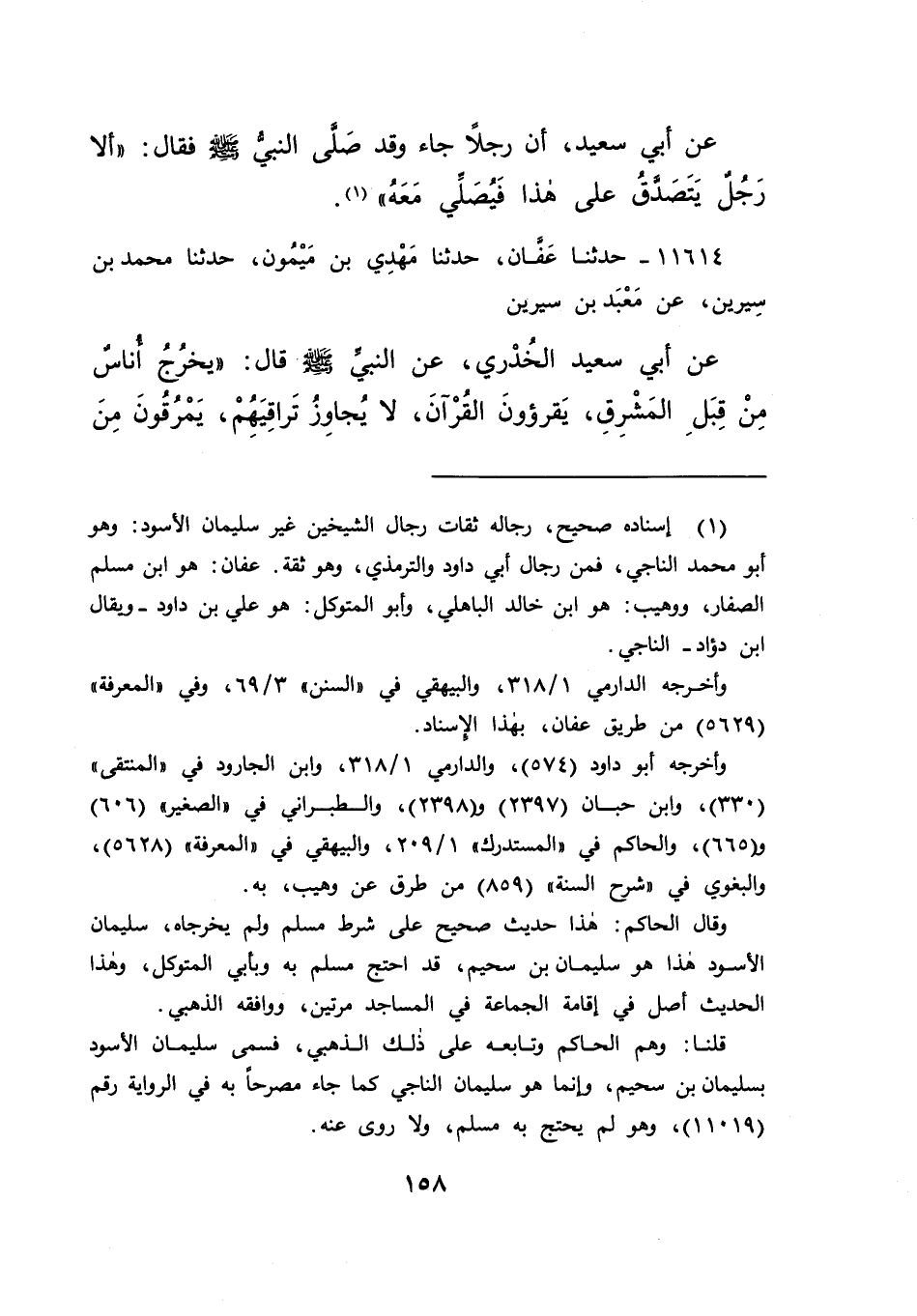 ١١٦١٤ - حَدَّثَنَا عَفَّانُ، حَدَّثَنَا مَهْدِيُّ بْنُ مَيْمُونٍ، حَدَّثَنَا مُحَمَّدُ بْنُ سِيرِينَ، عَنْ مَعْبَدِ بْنِ سِيرِينَ، عَنْ أَبِي سَعِيدٍ الْخُدْرِيِّ، عَنِ النَّبِيِّ صَلَّى اللهُ عَلَيْهِ وَسَلَّمَ قَالَ: " يَخْرُجُ أُنَاسٌ مِنْ قِبَلِ الْمَشْرِقِ يَقْرَءُونَ الْقُرْآنَ، لَا يُجَاوِزُ تَرَاقِيَهُمْ، يَمْرُقُونَ مِنَ