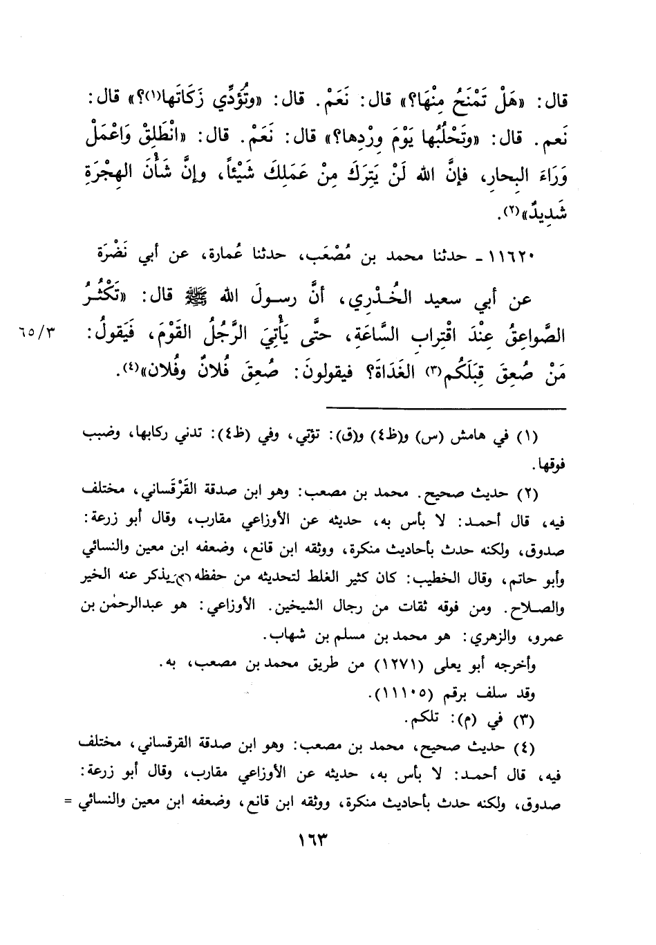 (٢) حديث صحيح. محمد بن مصعب: وهو ابن صدقة القَرْقَساني، مختلف فيه، قال أحمد: لا بأس به، حديثه عن الأوزاعي مقارب، وقال أبو زرعة: صدوق، ولكنه حدث بأحاديث منكرة، ووثقه ابن قانع، وضعفه ابن معين والنسائي وأبو حاتم، وقال الخطيب: كان كثير الغلط لتحديثه من حفظه، يذكر عنه الخير والصلاح. ومن فوقه ثقات من رجال الشيخين. الأوزاعي: هو عبد الرحمن بن