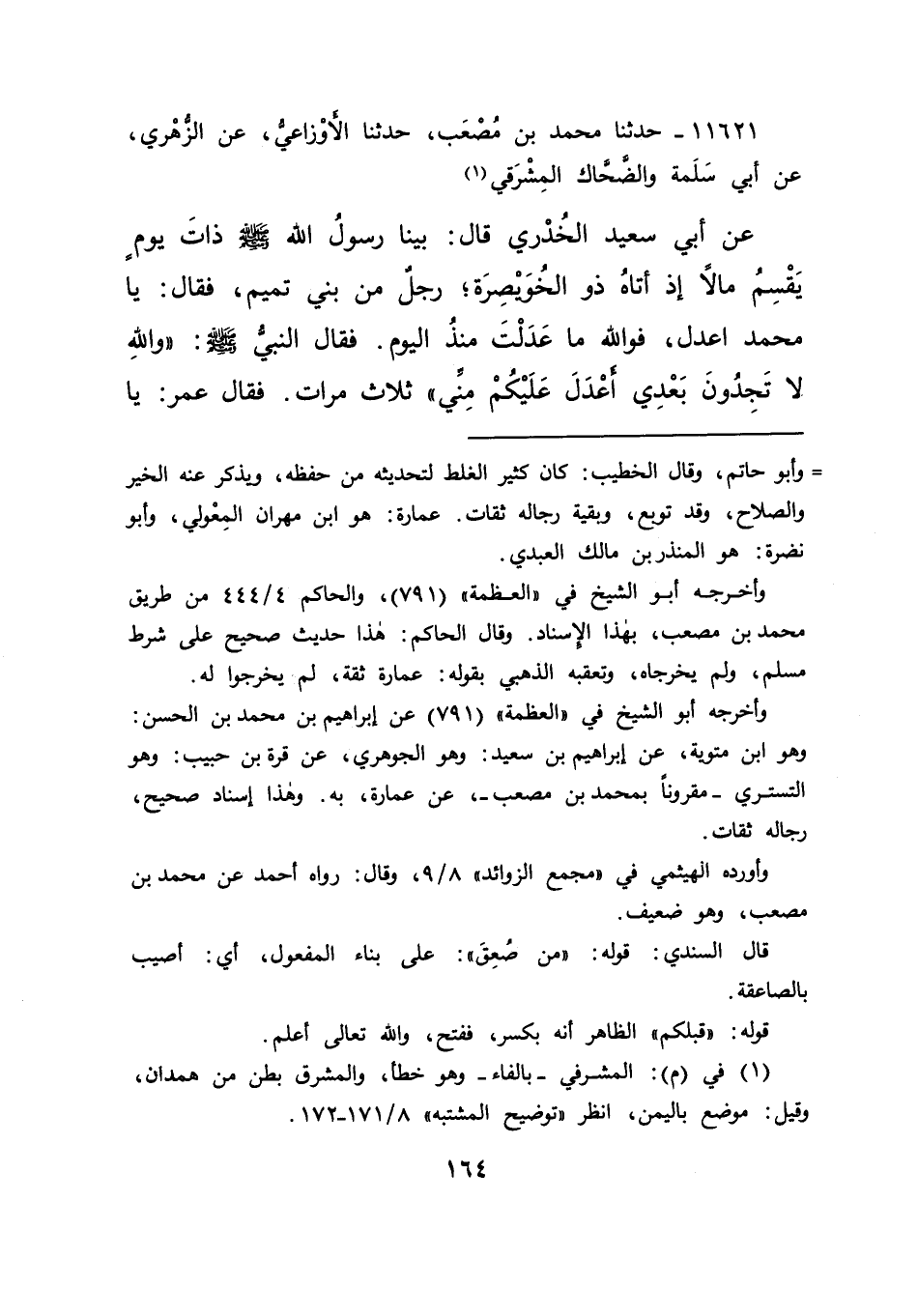 ١١٦٢١ - حَدَّثَنَا مُحَمَّدُ بْنُ مُصْعَبٍ، حَدَّثَنَا الْأَوْزَاعِيُّ، عَنِ الزُّهْرِيِّ، عَنْ أَبِي سَلَمَةَ، وَالضَّحَّاكِ الْمِشْرَقِيِّ، (١) عَنْ أَبِي سَعِيدٍ الْخُدْرِيِّ قَالَ: بَيْنَا رَسُولُ اللهِ صَلَّى اللهُ عَلَيْهِ وَسَلَّمَ ذَاتَ يَوْمٍ يَقْسِمُ مَالًا، إِذْ أَتَاهُ ذُو الْخُوَيْصِرَةِ - رَجُلٌ مِنْ بَنِي تَمِيمٍ - فَقَالَ: يَا مُحَمَّدُ اعْدِلْ، فَوَاللهِ مَا عَدَلْتَ مُنْذُ الْيَوْمَ، فَقَالَ النَّبِيُّ صَلَّى اللهُ عَلَيْهِ وَسَلَّمَ وَاللهِ: " لَا تَجِدُونَ بَعْدِي أَعْدَلَ عَلَيْكُمْ مِنِّي " ثَلَاثَ مَرَّاتٍ، فَقَالَ عُمَرُ: يَا