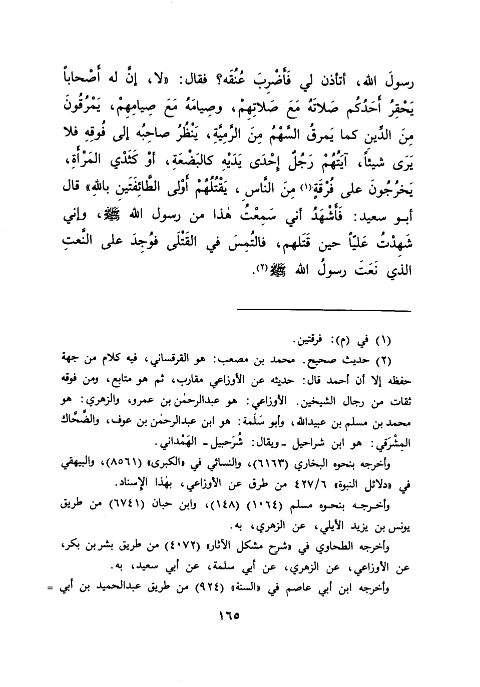 رَسُولَ اللهِ، أَتَأْذَنُ لِي فَأَضْرِبَ عُنُقَهُ؟ فَقَالَ: " لَا، إِنَّ لَهُ أَصْحَابًا يَحْقِرُ أَحَدُكُمْ صَلَاتَهُ مَعَ صَلَاتِهِمْ، وَصِيَامَهُ مَعَ صِيَامِهِمْ، يَمْرُقُونَ مِنَ الدِّينِ كَمَا يَمْرُقُ السَّهْمُ مِنَ الرَّمِيَّةِ، يَنْظُرُ صَاحِبُهُ إِلَى فُوقِهِ فَلَا يَرَى شَيْئًا، آيَتُهُمْ رَجُلٌ إِحْدَى يَدَيْهِ كَالْبَضْعَةِ، أَوْ كَثَدْيِ الْمَرْأَةِ، يَخْرُجُونَ عَلَى فُرْقَةٍ (١) مِنَ النَّاسِ، يَقْتُلُهُمْ أَوْلَى الطَّائِفَتَيْنِ بِاللهِ " قَالَ أَبُو سَعِيدٍ: " فَأَشْهَدُ أَنِّي سَمِعْتُ هَذَا مِنْ رَسُولِ اللهِ صَلَّى اللهُ عَلَيْهِ وَسَلَّمَ، وَأَنِّي شَهِدْتُ عَلِيًّا حِينَ قَتَلَهُمْ، فَالْتَمَسَ فِي الْقَتْلَى، فَوَجَدَ عَلَى النَّعْتِ الَّذِي نَعَتَ رَسُولُ اللهِ صَلَّى اللهُ عَلَيْهِ وَسَلَّمَ " (٢)