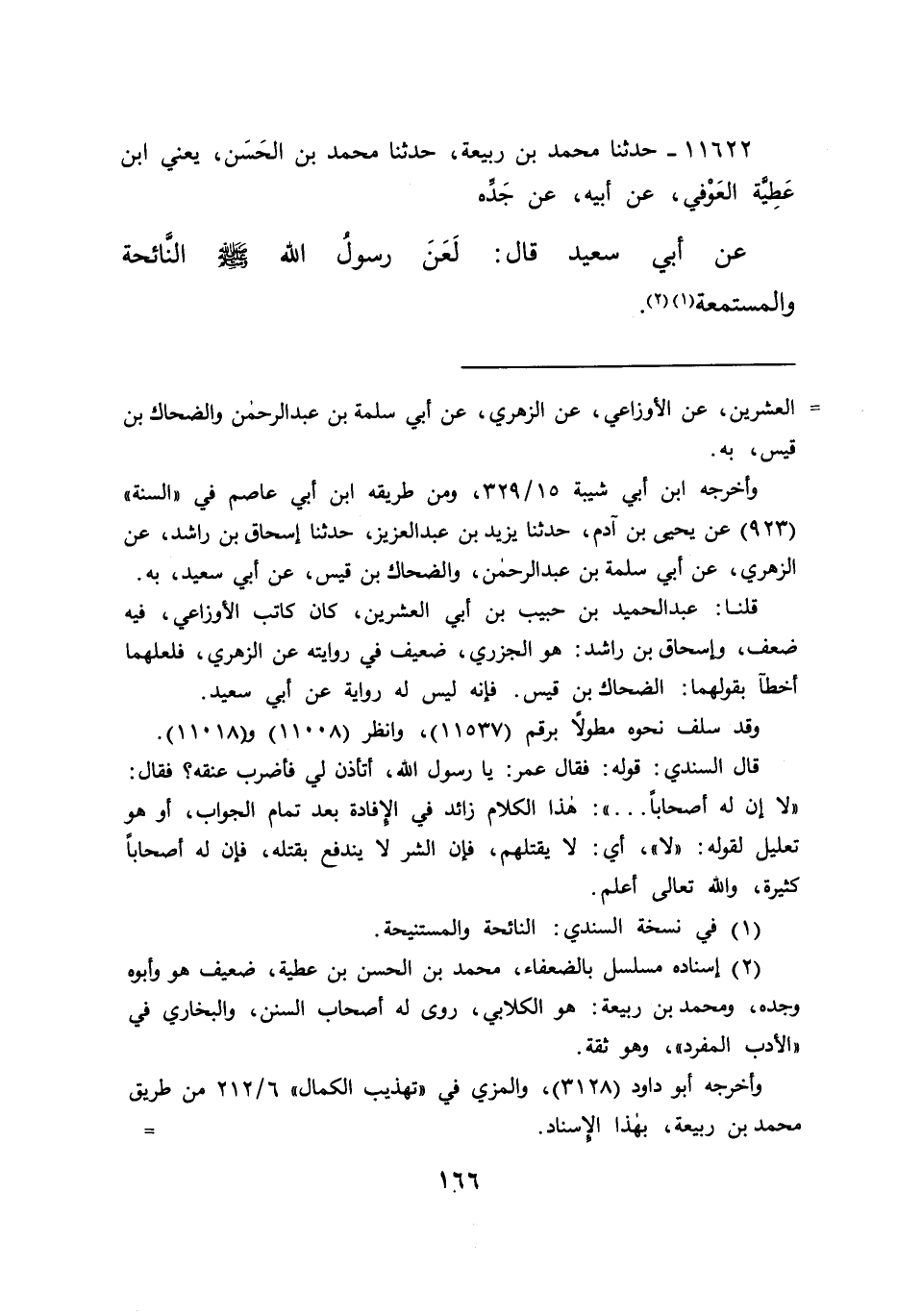 ١١٦٢٢ - حَدَّثَنَا مُحَمَّدُ بْنُ رَبِيعَةَ، حَدَّثَنَا مُحَمَّدُ بْنُ الْحَسَنِ يَعْنِي ابْنَ عَطِيَّةَ الْعَوْفِيَّ، عَنْ أَبِيهِ، عَنْ جَدِّهِ، عَنْ أَبِي سَعِيدٍ قَالَ: " لَعَنَ رَسُولُ اللهِ صَلَّى اللهُ عَلَيْهِ وَسَلَّمَ النَّائِحَةَ وَالْمُسْتَمِعَةَ (١) " (٢)