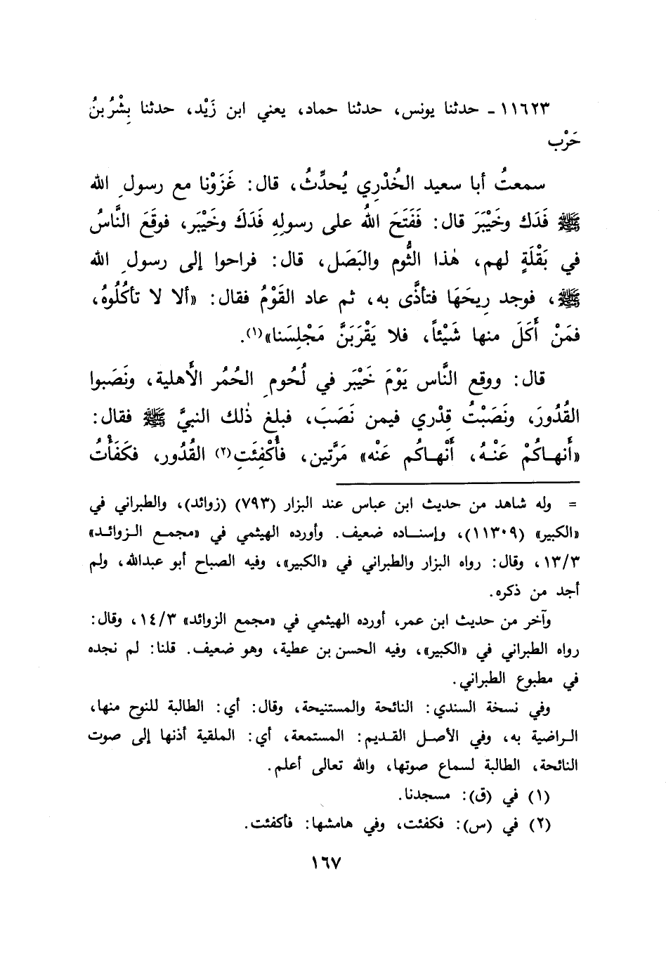 ١١٦٢٣ - حَدَّثَنَا يُونُسُ، حَدَّثَنَا حَمَّادٌ يَعْنِي ابْنَ زَيْدٍ، حَدَّثَنَا بِشْرُ بْنُ حَرْبٍ، سَمِعْتُ أَبَا سَعِيدٍ الْخُدْرِيَّ يُحَدِّثُ قَالَ: غَزَوْنَا مَعَ رَسُولِ اللهِ صَلَّى اللهُ عَلَيْهِ وَسَلَّمَ فَدَكَ وَخَيْبَرَ قَالَ: فَفَتَحَ اللهُ عَلَى رَسُولِهِ فَدَكَ وَخَيْبَرَ فَوَقَعَ النَّاسُ فِي بَقْلَةٍ لَهُمْ هَذَا الثُّومُ وَالْبَصَلُ، قَالَ: فَرَاحُوا إِلَى رَسُولِ اللهِ صَلَّى اللهُ عَلَيْهِ وَسَلَّمَ فَوَجَدَ رِيحَهَا، فَتَأَذَّى بِهِ، ثُمَّ عَادَ الْقَوْمُ، فَقَالَ: " أَلَا لَا تَأْكُلُوهُ، فَمَنْ أَكَلَ مِنْهَا شَيْئًا، فَلَا يَقْرَبَنَّ مَجْلِسَنَا " (١)