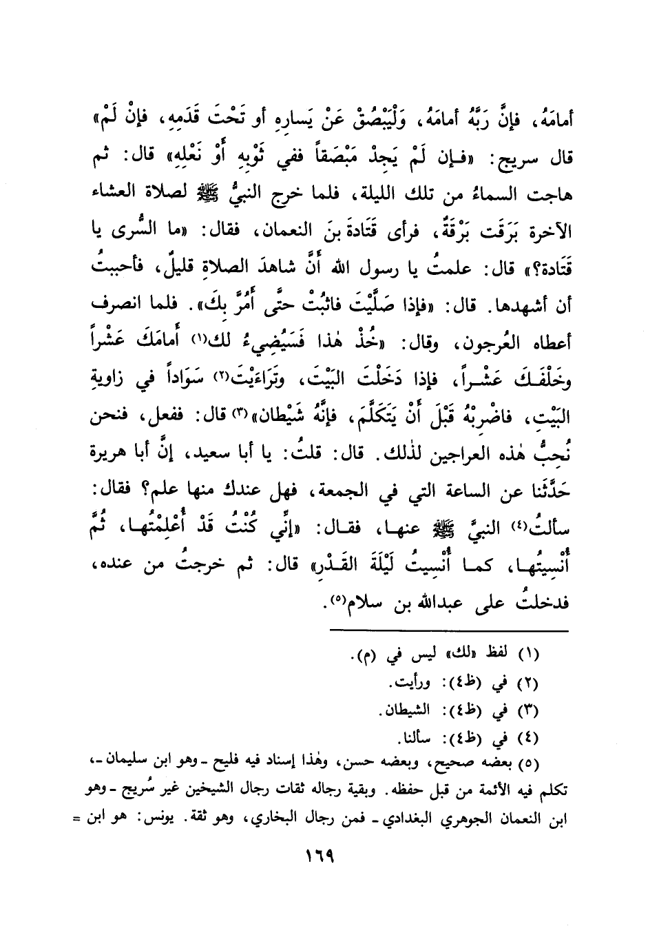 قَالَ: قُلْتُ: يَا أَبَا سَعِيدٍ، إِنَّ أَبَا هُرَيْرَةَ حَدَّثَنَا عَنِ السَّاعَةِ الَّتِي فِي الْجُمُعَةِ، فَهَلْ عِنْدَكَ مِنْهَا عِلْمٌ؟ فَقَالَ: سَأَلْتُ (٤) النَّبِيَّ صَلَّى اللهُ عَلَيْهِ وَسَلَّمَ عَنْهَا فَقَالَ: " إِنِّي كُنْتُ قَدْ أُعْلِمْتُهَا ثُمَّ أُنْسِيتُهَا، كَمَا أُنْسِيتُ لَيْلَةَ الْقَدْرِ " قَالَ: " ثُمَّ خَرَجْتُ مِنْ عِنْدِهِ، فَدَخَلْتُ عَلَى عَبْدِ اللهِ بْنِ سَلَامٍ " (٥)