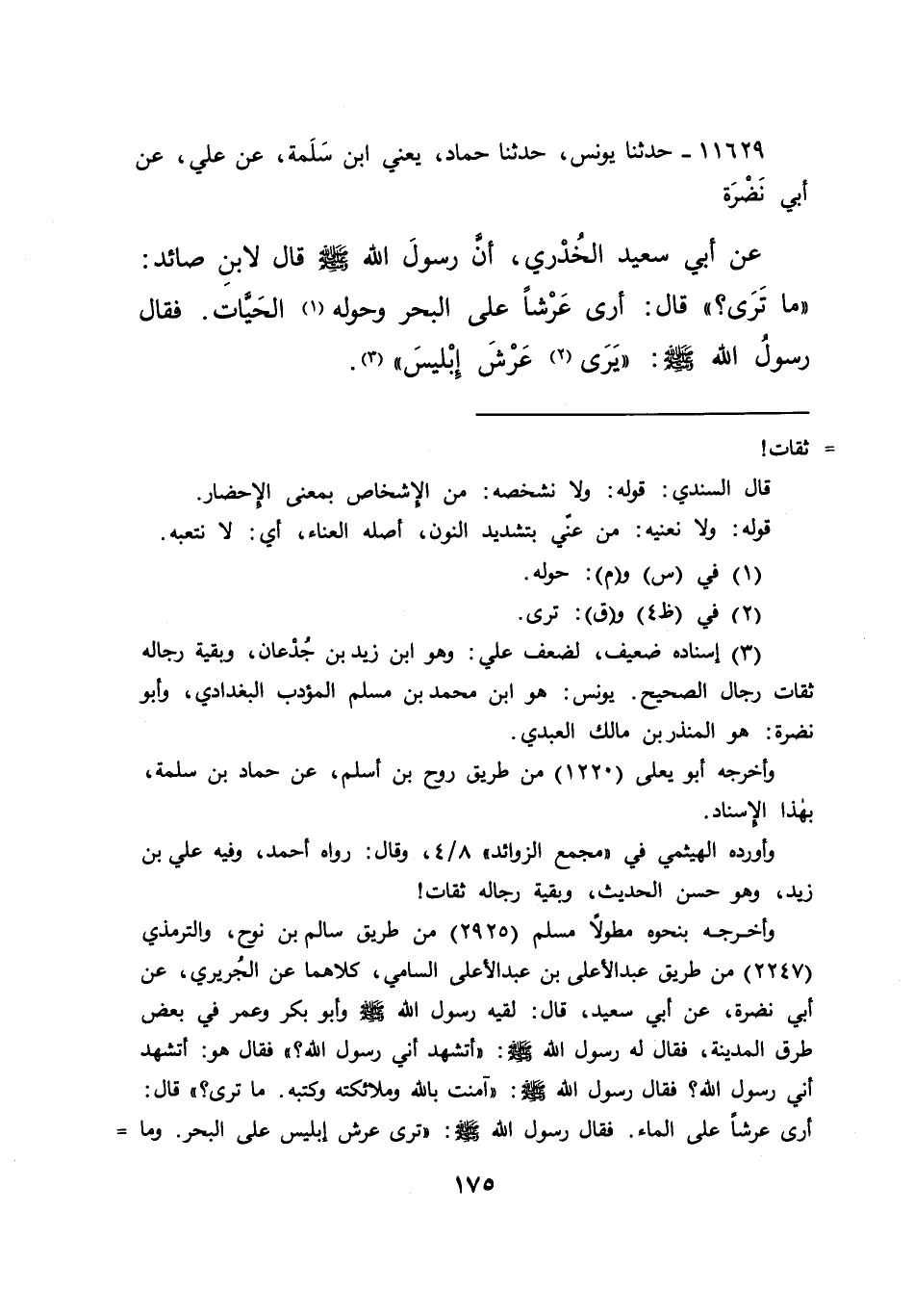 ١١٦٢٩ - حَدَّثَنَا يُونُسُ، حَدَّثَنَا حَمَّادٌ يَعْنِي ابْنَ سَلَمَةَ، عَنْ عَلِيٍّ، عَنْ أَبِي نَضْرَةَ، عَنْ أَبِي سَعِيدٍ الْخُدْرِيِّ، أَنَّ رَسُولَ اللهِ صَلَّى اللهُ عَلَيْهِ وَسَلَّمَ قَالَ لِابْنِ صَائِدٍ: " مَا تَرَى؟ " قَالَ: أَرَى عَرْشًا عَلَى الْبَحْرِ، وحوله (١) الْحَيَّاتُ، فَقَالَ رَسُولُ اللهِ صَلَّى اللهُ عَلَيْهِ وَسَلَّمَ: " يَرَى (٢) عَرْشَ إِبْلِيسَ " (٣)