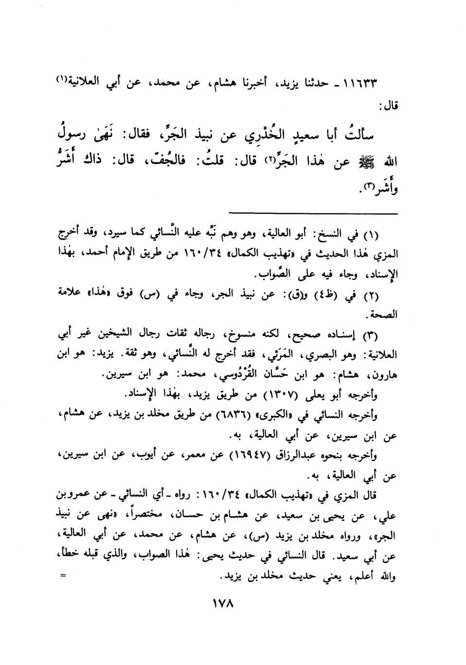 ١١٦٣٣ - حَدَّثَنَا يَزِيدُ، أَخْبَرَنَا هِشَامٌ، عَنْ مُحَمَّدٍ، عَنْ أَبِي الْعَلَانِيَةِ (١) قَالَ: سَأَلْتُ أَبَا سَعِيدٍ الْخُدْرِيَّ، عَنْ نَبِيذِ الْجَرِّ فَقَالَ: " نَهَى رَسُولُ اللهِ صَلَّى اللهُ عَلَيْهِ وَسَلَّمَ عَنْ هَذَا الْجَرِّ (٢) قَالَ: قُلْتُ: فَالْجُفُّ قَالَ: ذَاكَ أَشَرُّ وَأَشَرُّ (٣)