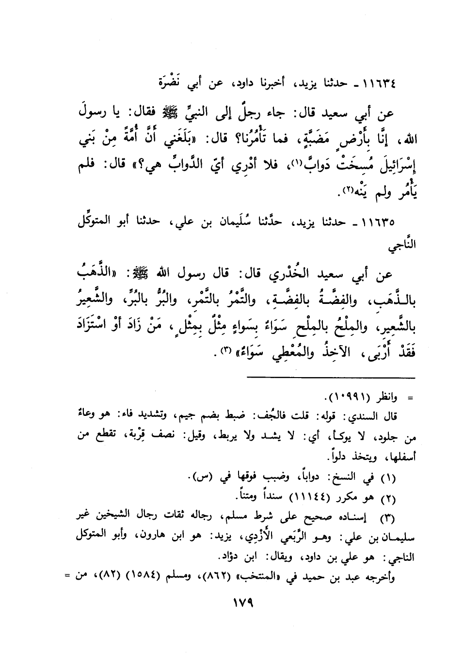 ١١٦٣٥ - حَدَّثَنَا يَزِيدُ، حَدَّثَنَا سُلَيْمَانُ بْنُ عَلِيٍّ، حَدَّثَنَا أَبُو الْمُتَوَكِّلِ النَّاجِيُّ، عَنْ أَبِي سَعِيدٍ الْخُدْرِيِّ قَالَ: قَالَ رَسُولُ اللهِ صَلَّى اللهُ عَلَيْهِ وَسَلَّمَ: " الذَّهَبُ بِالذَّهَبِ، وَالْفِضَّةُ بِالْفِضَّةِ، وَالتَّمْرُ بِالتَّمْرِ، وَالْبُرُّ بِالْبُرِّ، وَالشَّعِيرُ بِالشَّعِيرِ، وَالْمِلْحُ بِالْمِلْحِ، سَوَاءٌ بِسَوَاءٍ، مِثْلٌ بِمِثْلٍ، مَنْ زَادَ أَوْ اسْتَزَادَ فَقَدْ أَرْبَى، الْآخِذُ وَالْمُعْطِي سَوَاءٌ " (٣)