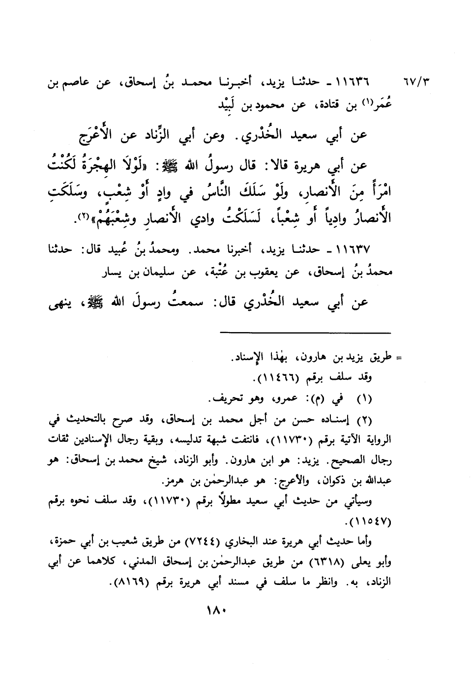 ١١٦٣٦ - حَدَّثَنَا يَزِيدُ، أَخْبَرَنَا مُحَمَّدُ بْنُ إِسْحَاقَ، عَنْ عَاصِمِ بْنِ عُمَرَ (١) بْنِ قَتَادَةَ، عَنْ مَحْمُودِ بْنِ لَبِيدٍ، عَنْ أَبِي سَعِيدٍ الْخُدْرِيِّ، وَعَنْ أَبِي الزِّنَادِ، عَنِ الْأَعْرَجِ، عَنْ أَبِي هُرَيْرَةَ قَالَا: قَالَ رَسُولُ اللهِ صَلَّى اللهُ عَلَيْهِ وَسَلَّمَ: " لَوْلَا الْهِجْرَةُ لَكُنْتُ امْرَأً مِنَ الْأَنْصَارِ، وَلَوْ سَلَكَ النَّاسُ فِي وَادٍ أَوْ شِعْبٍ، وَسَلَكَتِ الْأَنْصَارُ وَادِيًا أَوْ شِعْبًا، لَسَلَكْتُ وَادِيَ الْأَنْصَارِ وَشِعْبَهُمْ " (٢)