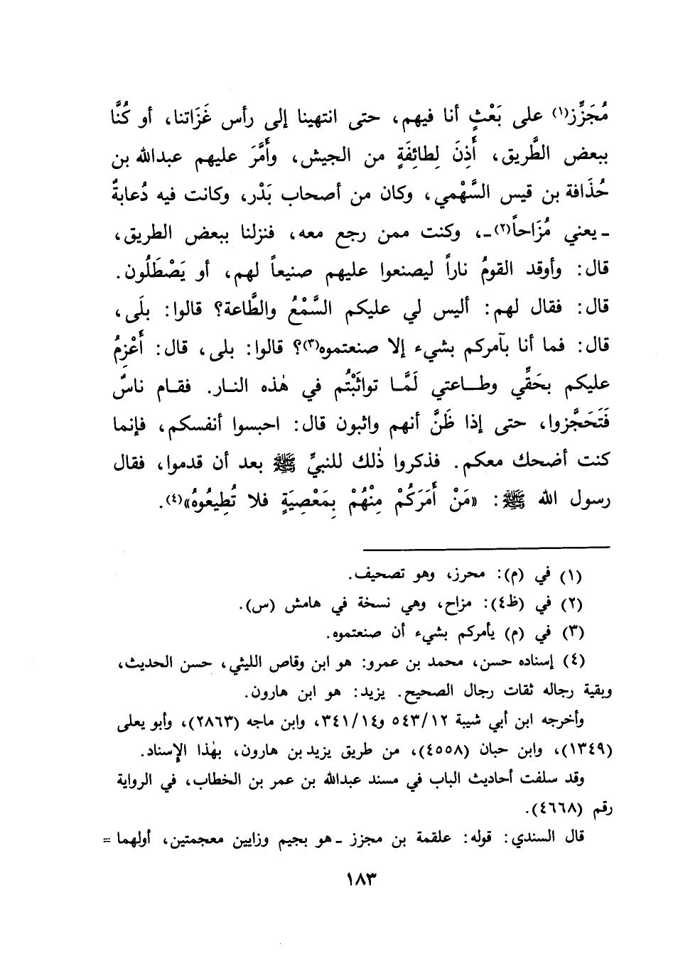 مُجَرِّزٍ (١) عَلَى بَعْثٍ أَنَا فِيهِمْ، حَتَّى انْتَهَيْنَا إِلَى رَأْسِ غَزَاتِنَا، أَوْ كُنَّا بِبَعْضِ الطَّرِيقِ أَذِنَ لِطَائِفَةٍ مِنَ الْجَيْشِ، وَأَمَّرَ عَلَيْهِمْ عَبْدَ اللهِ بْنَ حُذَافَةَ بْنِ قَيْسٍ السَّهْمِيَّ، وَكَانَ مِنْ أَصْحَابِ بَدْرٍ، وَكَانَتْ فِيهِ دُعَابَةٌ - يَعْنِي مُزَاحًا (٢) - وَكُنْتُ مِمَّنْ رَجَعَ مَعَهُ، فَنَزَلْنَا بِبَعْضِ الطَّرِيقِ، قَالَ: وَأَوْقَدَ الْقَوْمُ نَارًا لِيَصْنَعُوا عَلَيْهَا صَنِيعًا لَهُمْ، أَوْ يَصْطَلُونَ قَالَ: فَقَالَ لَهُمْ: أَلَيْسَ لِي عَلَيْكُمُ السَّمْعُ وَالطَّاعَةُ؟ قَالُوا: بَلَى. قَالَ: فَمَا أَنَا بِآمِرِكُمْ بِشَيْءٍ إِنْ صَنَعْتُمُوهُ (٣) ؟ قَالُوا: بَلَى. قَالَ: أَعْزِمُ عَلَيْكُمْ بِحَقِّي وَطَاعَتِي، لَمَا تَوَاثَبْتُمْ فِي هَذِهِ النَّارِ، فَقَامَ نَاسٌ فَتَحَجَّزُوا، حَتَّى إِذَا ظَنَّ أَنَّهُمْ وَاثِبُونَ، قَالَ: احْبِسُوا أَنْفُسَكُمْ، فَإِنَّمَا كُنْتُ أَضْحَكُ مَعَكُمْ، فَذَكَرُوا ذَلِكَ لِلنَّبِيِّ صَلَّى اللهُ عَلَيْهِ وَسَلَّمَ بَعْدَ أَنْ قَدِمُوا، فَقَالَ رَسُولُ اللهِ صَلَّى اللهُ عَلَيْهِ وَسَلَّمَ: " مَنْ أَمَرَكُمْ مِنْهُمْ بِمَعْصِيَةٍ، فَلَا تُطِيعُوهُ " (٤)