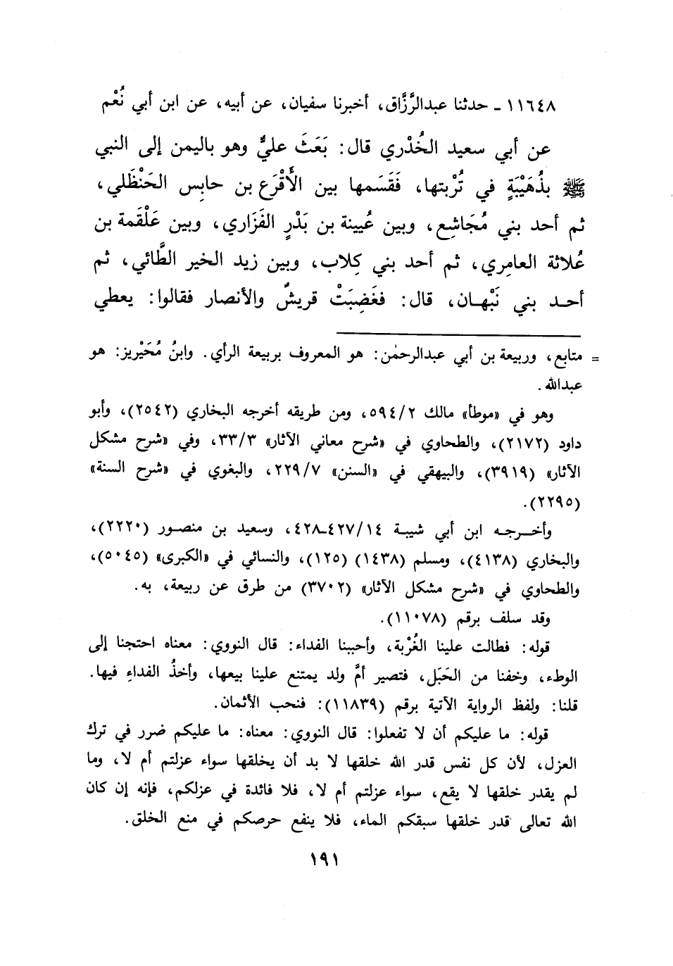 ١١٦٤٨ - حَدَّثَنَا عَبْدُ الرَّزَّاقِ، أَخْبَرَنَا سُفْيَانُ، عَنْ أَبِيهِ، عَنِ ابْنِ أَبِي نُعْمٍ، عَنْ أَبِي سَعِيدٍ الْخُدْرِيِّ قَالَ: بَعَثَ عَلِيٌّ وَهُوَ بِالْيَمَنِ إِلَى النَّبِيِّ صَلَّى اللهُ عَلَيْهِ وَسَلَّمَ بِذُهَيْبَةٍ فِي تُرْبَتِهَا، فَقَسَمَهَا بَيْنَ الْأَقْرَعِ بْنِ حَابِسٍ الْحَنْظَلِيِّ، ثُمَّ أَحَدِ بَنِي مُجَاشِعٍ، وَبَيْنَ عُيَيْنَةَ بْنِ بَدْرٍ الْفَزَارِيِّ، وَبَيْنَ عَلْقَمَةَ بْنِ عُلَاثَةَ الْعَامِرِيِّ، ثُمَّ أَحَدِ بَنِي كِلَابٍ، وَبَيْنَ زَيْدِ الْخَيْرِ الطَّائِيِّ، ثُمَّ أَحَدِ بَنِي نَبْهَانَ، قَالَ: فَغَضِبَتْ قُرَيْشٌ وَالْأَنْصَارُ، فَقَالُوا: يُعْطِي