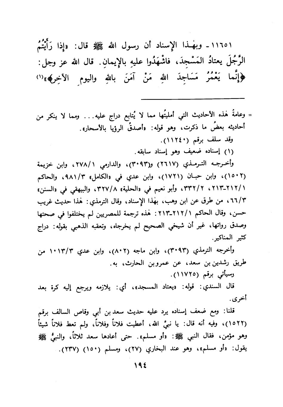 ١١٦٥١ - وَبِهَذَا الْإِسْنَادِ أَنَّ رَسُولَ اللهِ صَلَّى اللهُ عَلَيْهِ وَسَلَّمَ قَالَ: " إِذَا رَأَيْتُمُ الرَّجُلَ يَعْتَادُ الْمَسْجِدَ، فَاشْهَدُوا عَلَيْهِ بِالْإِيمَانِ، قَالَ اللهُ عَزَّ وَجَلَّ ": {إِنَّمَا يَعْمُرُ مَسَاجِدَ اللهِ، مَنْ آمَنَ بِاللهِ وَالْيَوْمِ الْآخِرِ} (١)