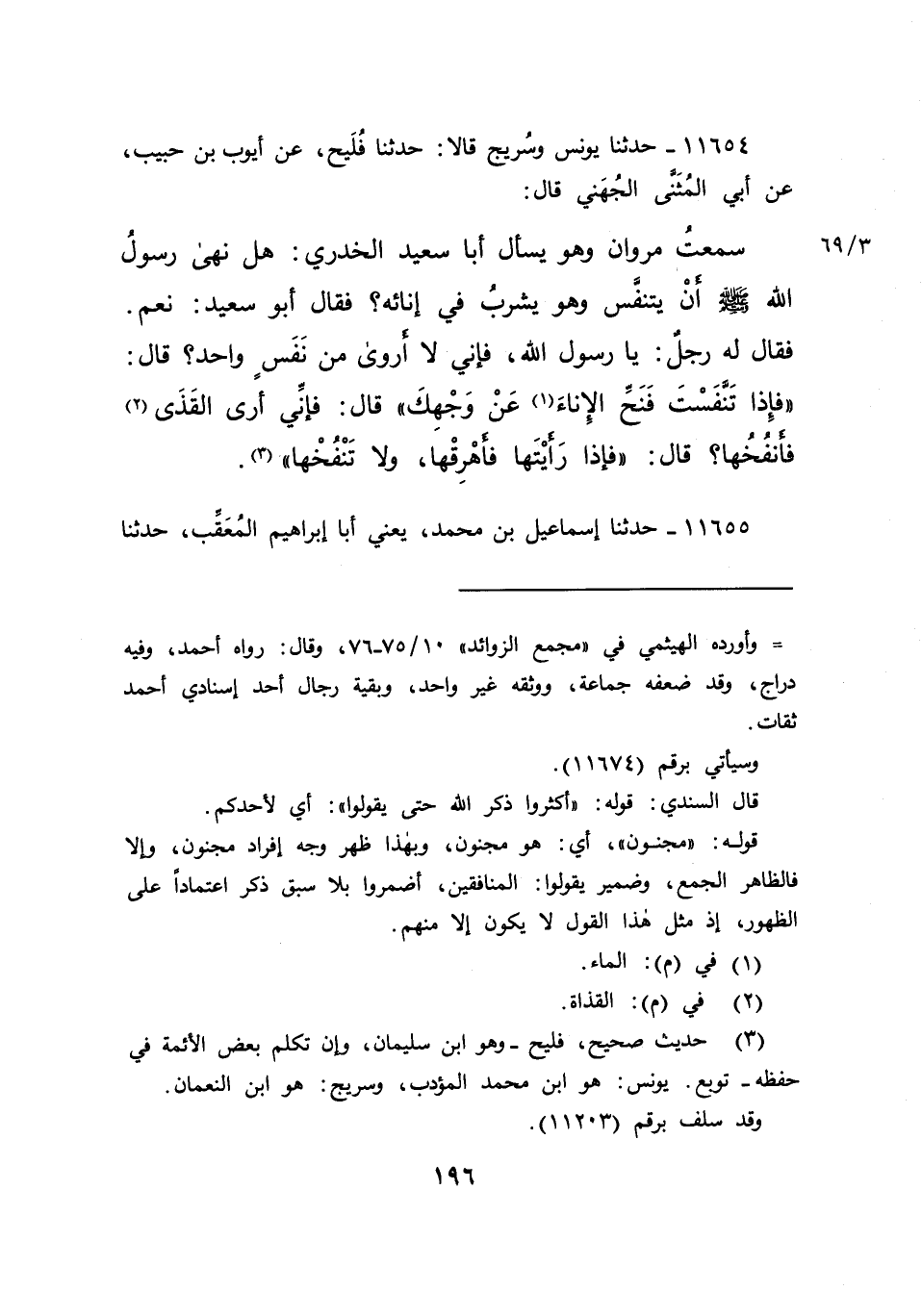 ١١٦٥٤ - حَدَّثَنَا يُونُسُ، وَسُرَيْجٌ، قَالَا: حَدَّثَنَا فُلَيْحٌ، عَنْ أَيُّوبَ بْنِ حَبِيبٍ، عَنْ أَبِي الْمُثَنَّى الْجُهَنِيِّ قَالَ: سَمِعْتُ مَرْوَانَ وَهُوَ يَسْأَلُ أَبَا سَعِيدٍ الْخُدْرِيَّ: هَلْ نَهَى رَسُولُ اللهِ صَلَّى اللهُ عَلَيْهِ وَسَلَّمَ أَنْ يَتَنَفَّسَ وَهُوَ يَشْرَبُ فِي إِنَائِهِ؟ فَقَالَ أَبُو سَعِيدٍ: نَعَمْ. فَقَالَ لَهُ رَجُلٌ: يَا رَسُولَ اللهِ، فَإِنِّي لَا أُرْوَى مِنْ نَفَسٍ وَاحِدٍ؟ قَالَ: " فَإِذَا تَنَفَّسْتَ، فَنَحِّ الْإِنَاءَ (١) عَنْ وَجْهِكَ "، قَالَ: فَإِنِّي أَرَى الْقَذَى (٢) فَأَنْفُخُهَا؟ قَالَ: " فَإِذَا رَأَيْتَهَا فَأَهْرِقْهَا، وَلَا تَنْفُخْهَا " (٣)