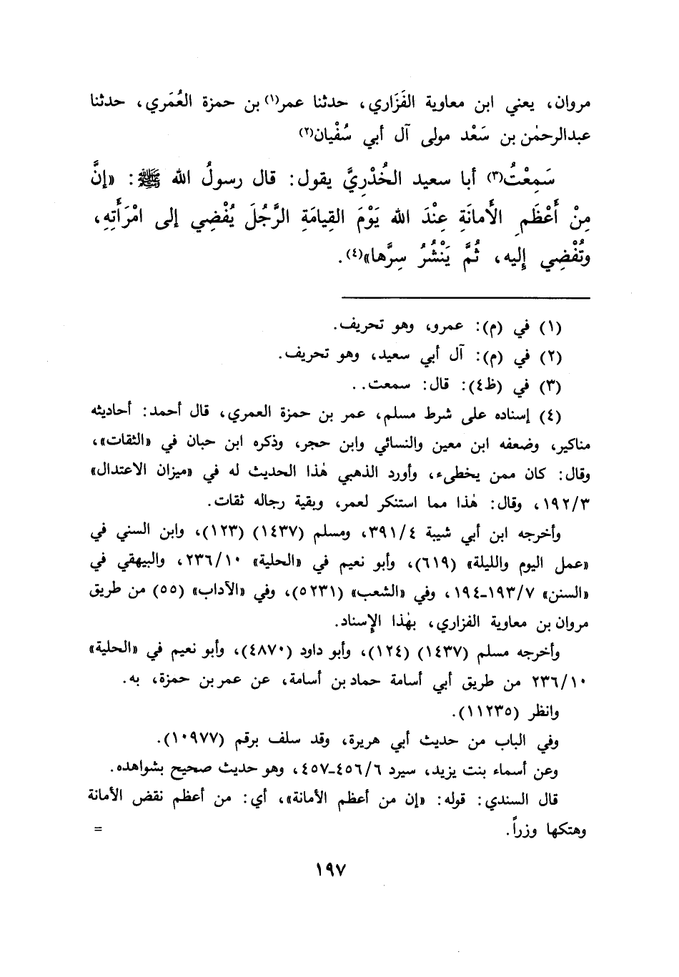 مَرْوَانُ يَعْنِي ابْنَ مُعَاوِيَةَ الْفَزَارِيَّ، حَدَّثَنَا عُمَرُ (١) بْنُ حَمْزَةَ الْعُمَرِيُّ، حَدَّثَنَا عَبْدُ الرَّحْمَنِ بْنُ سَعْدٍ، مَوْلَى آلِ أَبِي سُفْيَانَ، (٢) سَمِعْتُ (٣) أَبَا سَعِيدٍ الْخُدْرِيَّ يَقُولُ: قَالَ رَسُولُ اللهِ صَلَّى اللهُ عَلَيْهِ وَسَلَّمَ: " إِنَّ مِنْ أَعْظَمِ الْأَمَانَةِ عِنْدَ اللهِ يَوْمَ الْقِيَامَةِ، الرَّجُلَ يُفْضِي إِلَى امْرَأَتِهِ، وَتُفْضِي إِلَيْهِ، ثُمَّ يَنْشُرُ سِرَّهَا " (٤)