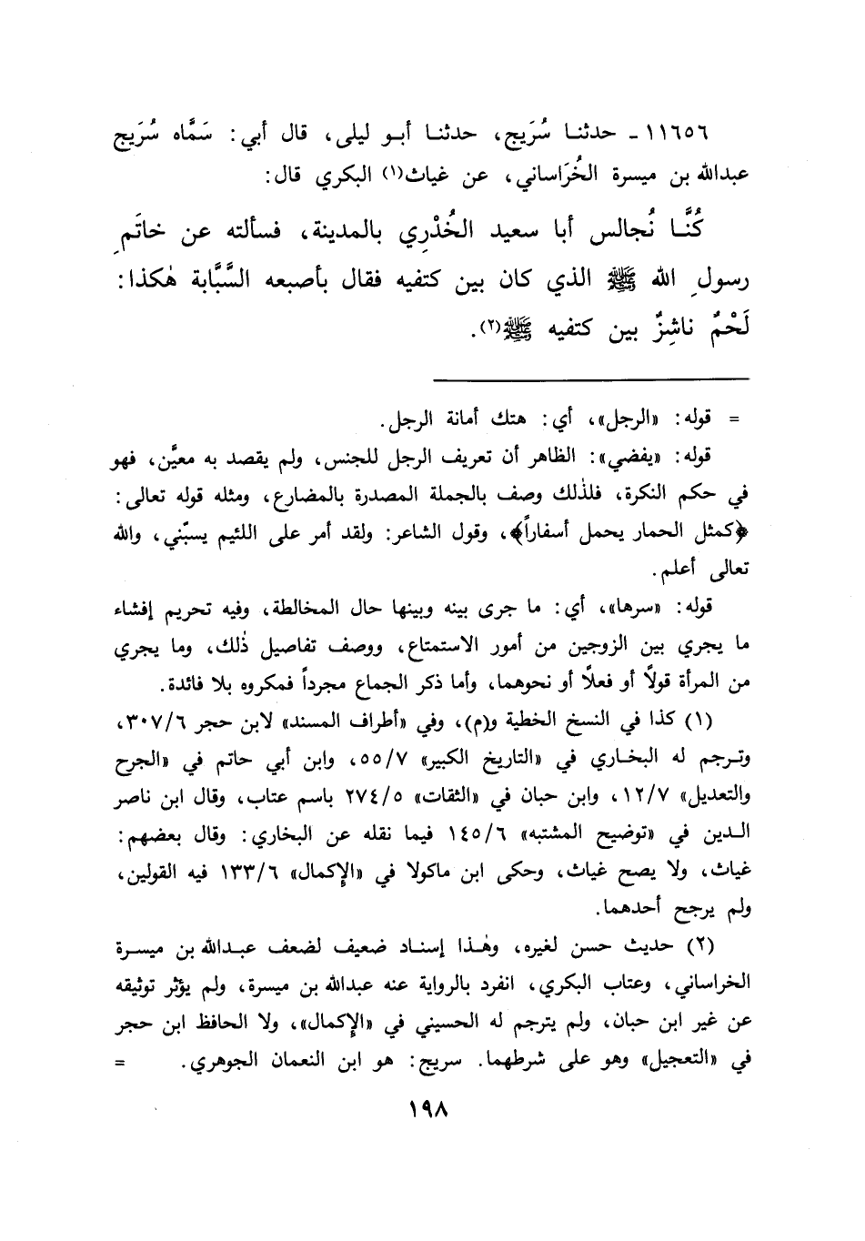 ١١٦٥٦ - حَدَّثَنَا سُرَيْجٌ، حَدَّثَنَا أَبُو لَيْلَى، قَالَ أَبِي: " سَمَّاهُ سُرَيْجٌ: عَبْدَ اللهِ بْنَ مَيْسَرَةَ الْخُرَاسَانِيَّ "، عَنْ غياث (١) الْبَكْرِيِّ قَالَ: كُنَّا نُجَالِسُ أَبَا سَعِيدٍ الْخُدْرِيَّ بِالْمَدِينَةِ، فَسَأَلْتُهُ عَنْ خَاتَمِ رَسُولِ اللهِ صَلَّى اللهُ عَلَيْهِ وَسَلَّمَ الَّذِي كَانَ بَيْنَ كَتِفَيْهِ، فَقَالَ: بِأُصْبُعِهِ السَّبَّابَةِ، " هَكَذَا لَحْمٌ نَاشِزٌ بَيْنَ كَتِفَيْهِ صَلَّى اللهُ عَلَيْهِ وَسَلَّمَ " (٢)