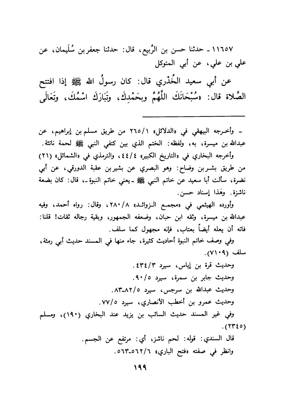 ١١٦٥٧ - حَدَّثَنَا حَسَنُ بْنُ الرَّبِيعِ قَالَ: حَدَّثَنَا جَعْفَرُ بْنُ سُلَيْمَانَ، عَنْ عَلِيِّ بْنِ عَلِيٍّ، عَنْ أَبِي الْمُتَوَكِّلِ، عَنْ أَبِي سَعِيدٍ الْخُدْرِيِّ قَالَ: كَانَ رَسُولُ اللهِ صَلَّى اللهُ عَلَيْهِ وَسَلَّمَ إِذَا افْتَتَحَ الصَّلَاةَ قَالَ " سُبْحَانَكَ اللهُمَّ وَبِحَمْدِكَ، وَتَبَارَكَ اسْمُكَ، وَتَعَالَى