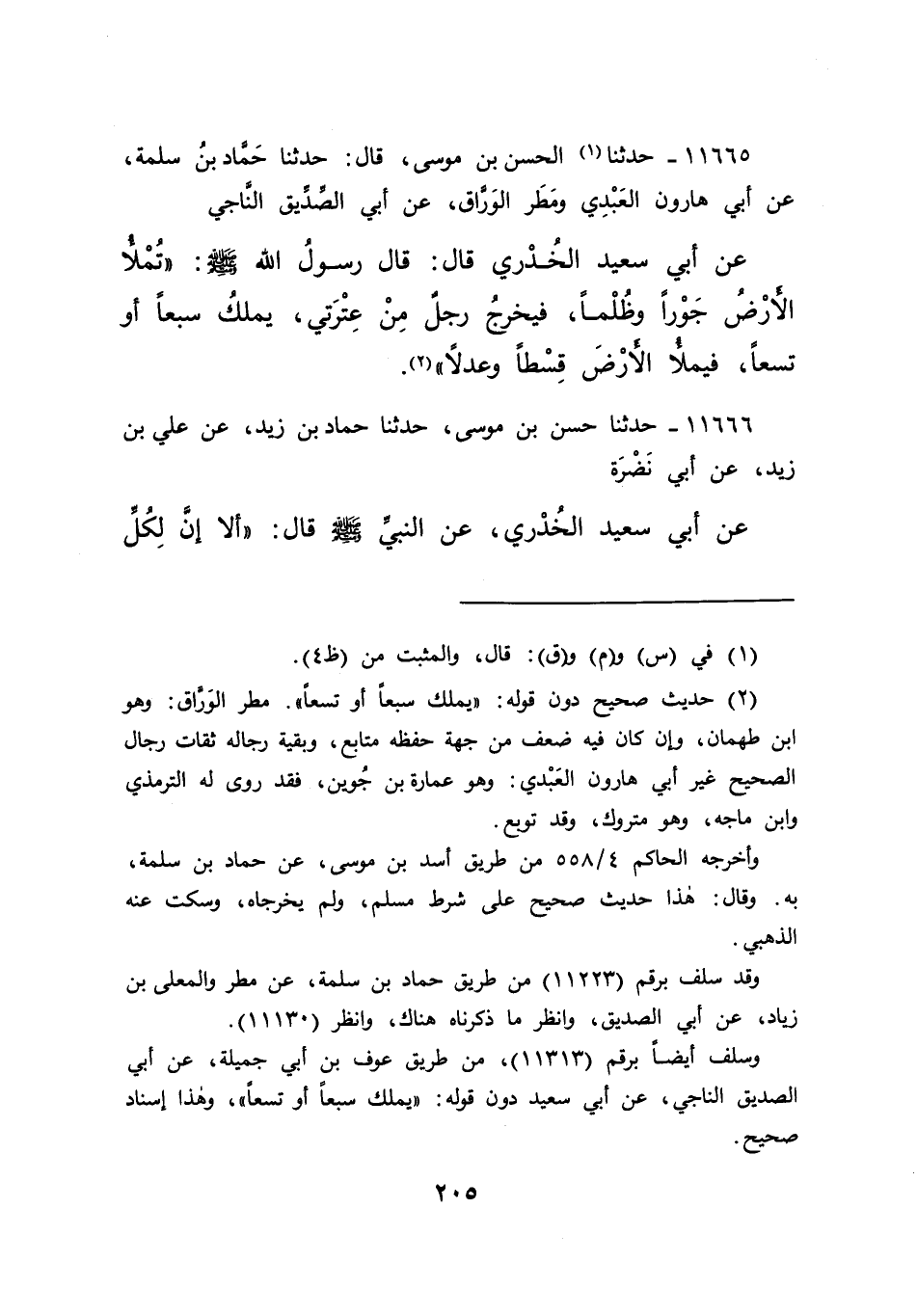 ١١٦٦٥ - حَدَّثَنَا (١) الْحَسَنُ بْنُ مُوسَى، قَالَ: حَدَّثَنَا حَمَّادُ بْنُ سَلَمَةَ، عَنْ أَبِي هَارُونَ الْعَبْدِيِّ، وَمَطَرٌ الْوَرَّاقُ، عَنْ أَبِي الصِّدِّيقِ النَّاجِيِّ، عَنْ أَبِي سَعِيدٍ الْخُدْرِيِّ قَالَ: قَالَ رَسُولُ اللهِ صَلَّى اللهُ عَلَيْهِ وَسَلَّمَ: " تُمْلَأُ الْأَرْضُ جَوْرًا وَظُلْمًا، فَيَخْرُجُ رَجُلٌ مِنْ عِتْرَتِي، يَمْلِكُ سَبْعًا أَوْ تِسْعًا، فَيَمْلَأُ الْأَرْضَ قِسْطًا وَعَدْلًا " (٢)