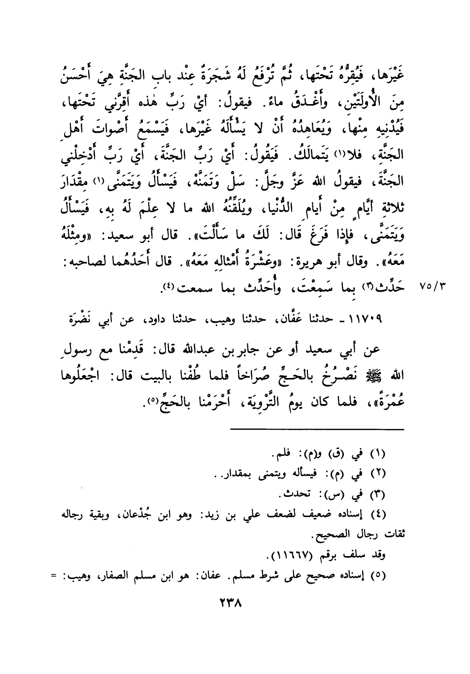 ١١٧٠٩ - حَدَّثَنَا عَفَّانُ، حَدَّثَنَا وُهَيْبٌ، حَدَّثَنَا دَاوُدُ، عَنْ أَبِي نَضْرَةَ، عَنْ أَبِي سَعِيدٍ، أَوْ عَنْ جَابِرِ بْنِ عَبْدِ اللهِ قَالَ: قَدِمْنَا مَعَ رَسُولِ اللهِ صَلَّى اللهُ عَلَيْهِ وَسَلَّمَ نَصْرُخُ بِالْحَجِّ صُرَاخًا، فَلَمَّا طُفْنَا بِالْبَيْتِ قَالَ: " اجْعَلُوهَا عُمْرَةً "، فَلَمَّا كَانَ يَوْمُ التَّرْوِيَةِ، أَحْرَمْنَا بِالْحَجِّ (٥)