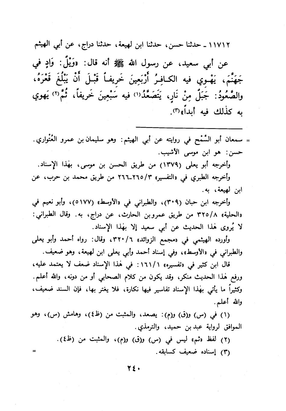 ١١٧١٢ - حَدَّثَنَا حَسَنٌ، حَدَّثَنَا ابْنُ لَهِيعَةَ، حَدَّثَنَا دَرَّاجٌ، عَنْ أَبِي الْهَيْثَمِ، عَنْ أَبِي سَعِيدٍ، عَنْ رَسُولِ اللهِ صَلَّى اللهُ عَلَيْهِ وَسَلَّمَ أَنَّهُ قَالَ: " وَيْلٌ: وَادٍ فِي جَهَنَّمَ، يَهْوِي فِيهِ الْكَافِرُ أَرْبَعِينَ خَرِيفًا قَبْلَ أَنْ يَبْلُغَ قَعْرَهُ، وَالصَّعُودُ: جَبَلٌ مِنْ نَارٍ، يَصْعَدُ (١) فِيهِ سَبْعِينَ خَرِيفًا، ثُمَّ (٢) يَهْوِي بِهِ كَذَلِكَ فِيهِ أَبَدًا " (٣)