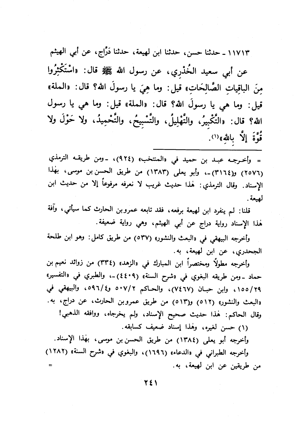 ١١٧١٣ - حَدَّثَنَا حَسَنٌ، حَدَّثَنَا ابْنُ لَهِيعَةَ، حَدَّثَنَا دَرَّاجٌ، عَنْ أَبِي الْهَيْثَمِ، عَنْ أَبِي سَعِيدٍ الْخُدْرِيِّ، عَنْ رَسُولِ اللهِ صَلَّى اللهُ عَلَيْهِ وَسَلَّمَ قَالَ: " اسْتَكْثِرُوا مِنَ الْبَاقِيَاتِ الصَّالِحَاتِ " قِيلَ: وَمَا هِيَ يَا رَسُولَ اللهِ؟ قَالَ: " الْمِلَّةُ "، قِيلَ: وَمَا هِيَ يَا رَسُولَ اللهِ؟ قَالَ: " الْمِلَّةُ "، قِيلَ: وَمَا هِيَ يَا رَسُولَ اللهِ؟ قَالَ: " التَّكْبِيرُ، وَالتَّهْلِيلُ، وَالتَّسْبِيحُ، وَالتَّحْمِيدُ، وَلَا حَوْلَ وَلَا قُوَّةَ إِلَّا بِاللهِ " (١)