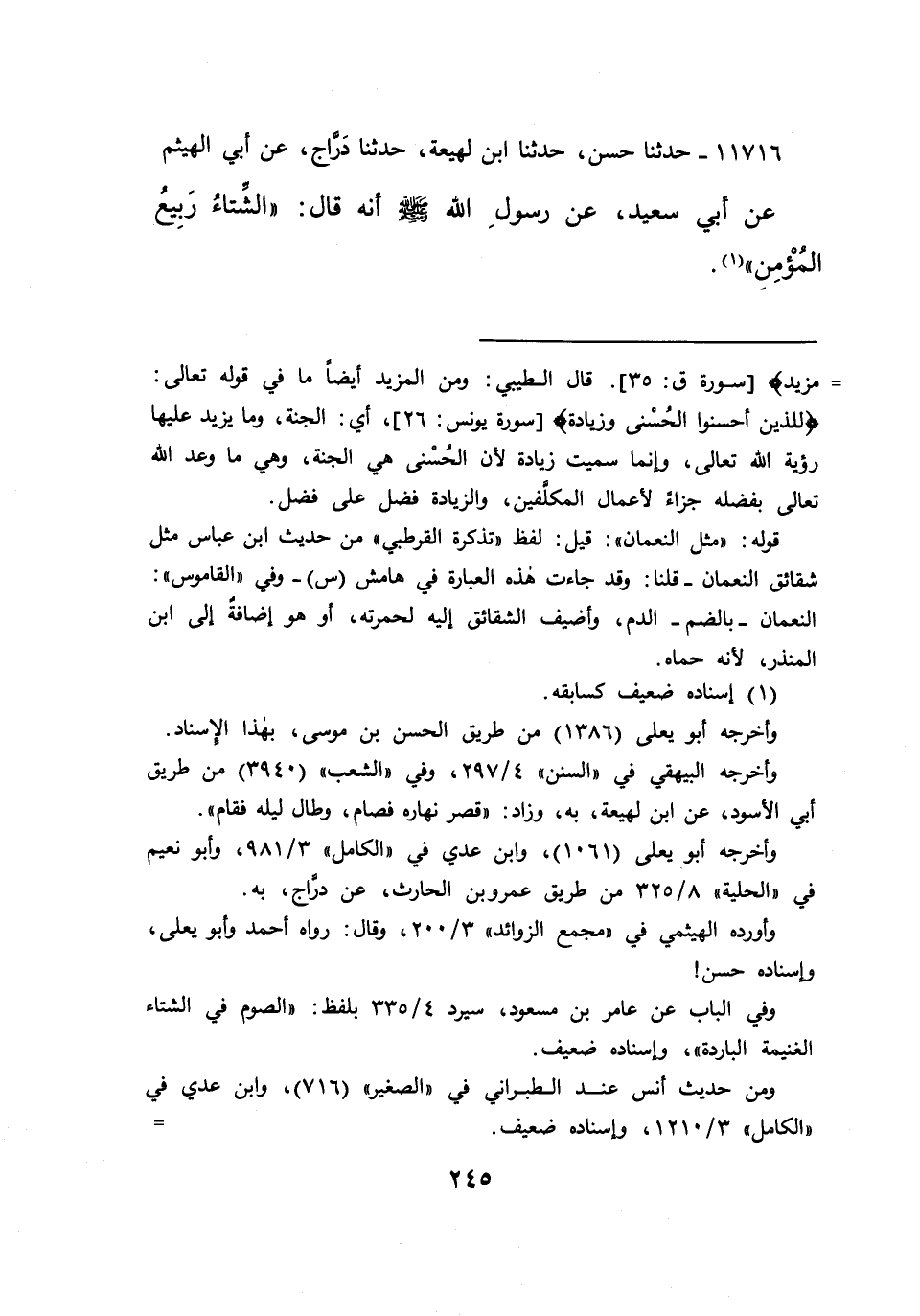 ١١٧١٦ - حَدَّثَنَا حَسَنٌ، حَدَّثَنَا ابْنُ لَهِيعَةَ، حَدَّثَنَا دَرَّاجٌ، عَنْ أَبِي الْهَيْثَمِ، عَنْ أَبِي سَعِيدٍ، عَنْ رَسُولِ اللهِ صَلَّى اللهُ عَلَيْهِ وَسَلَّمَ أَنَّهُ قَالَ: " الشِّتَاءُ رَبِيعُ الْمُؤْمِنِ " (١)